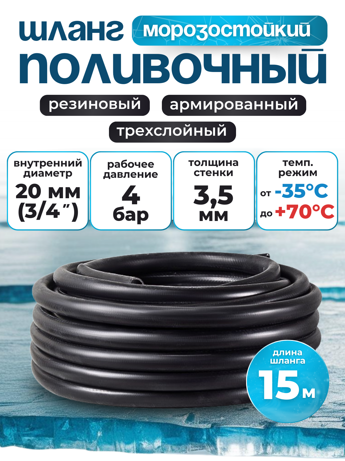 Шланг поливочный резиновый армированный нитью 20мм 5м Толщ. стенки 3,5мм морозостойкий (t от -35 С до +70 С)