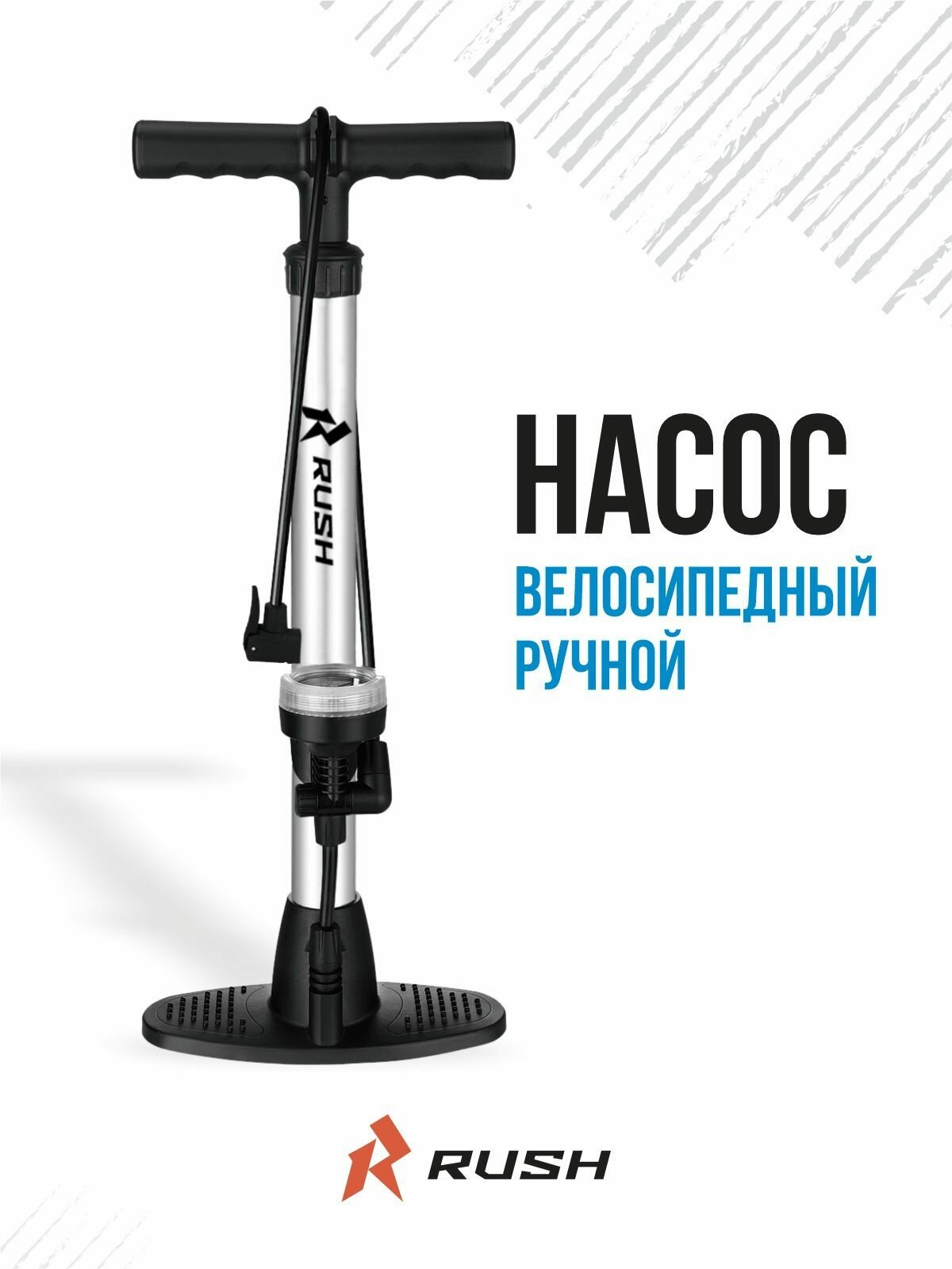 Насос ручной стальной велосипедный с манометром T-ручка 38x480мм RUSH HOUR. Шланг велонасоса под ниппель AV/FV.