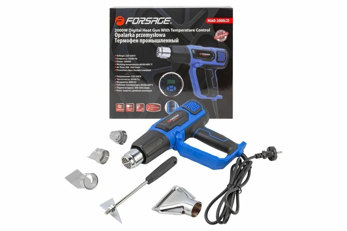 Фен промышленный F-HG60-2000LCD с дисплеем и насадками (220В,50/60Гц,2000Вт, 60-600С, 300-500л/мин, кл. защиты-двойная изоляция) FORSAGE