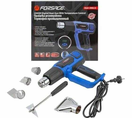 Купить Фен промышленный F-HG60-2000LCD с дисплеем и насадками (220В,50/60Гц,2000Вт, 60-600С, 300-500л/мин, кл. защиты-двойная изоляция) FORSAGE