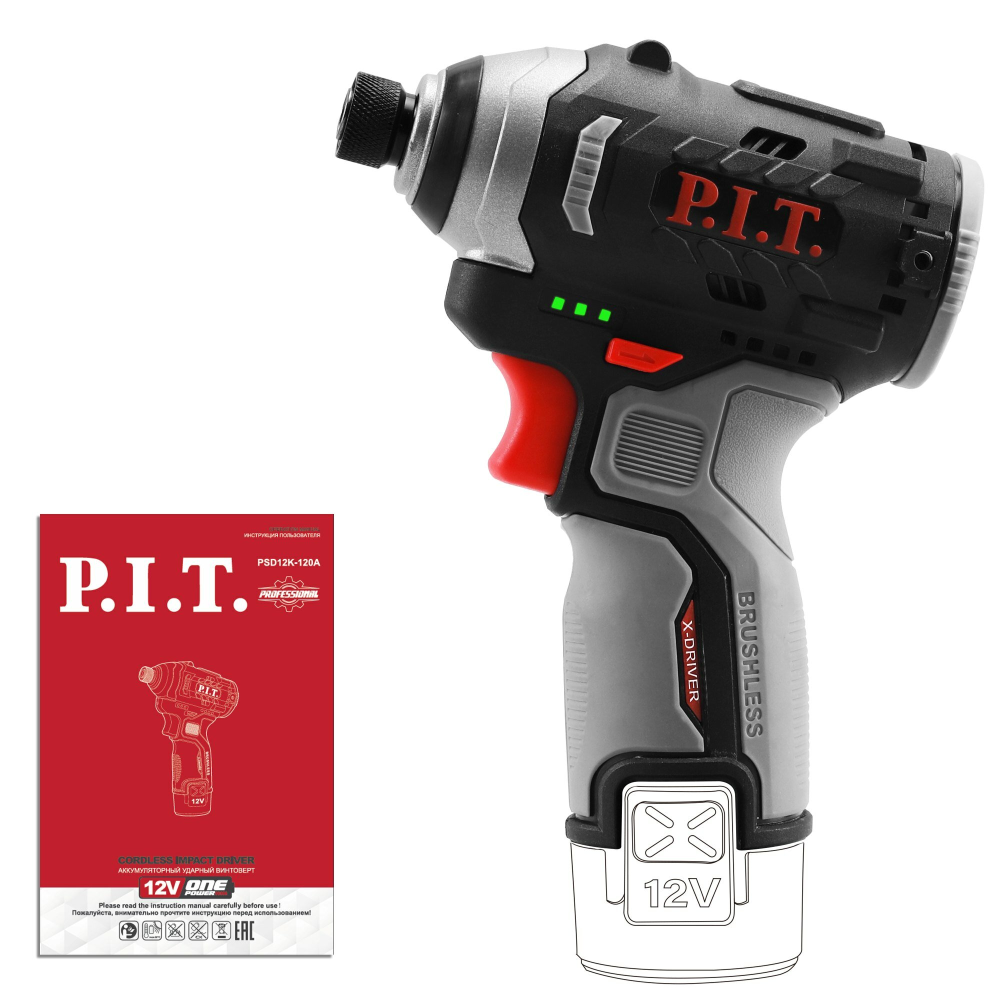 Винтоверт IMPACT аккум. бесщёточный P.I.T. PSD12K-120A SOLO 12В, 120Нм, 3 ск, 4300 уд, HEX 1/4"