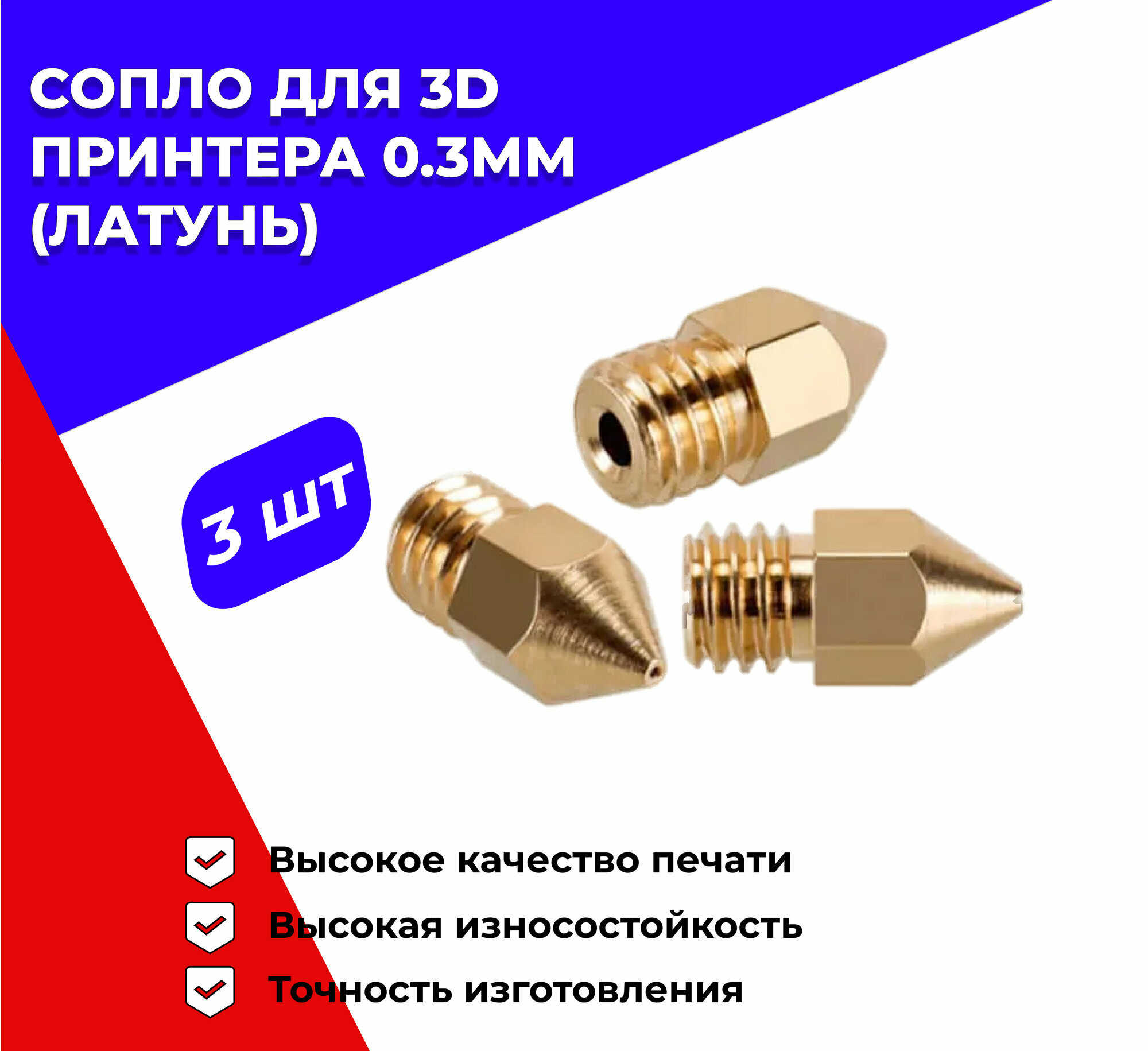 Купить Сопло МК8 (mk8) 0.3 мм для 3D принтера, комплект 3шт