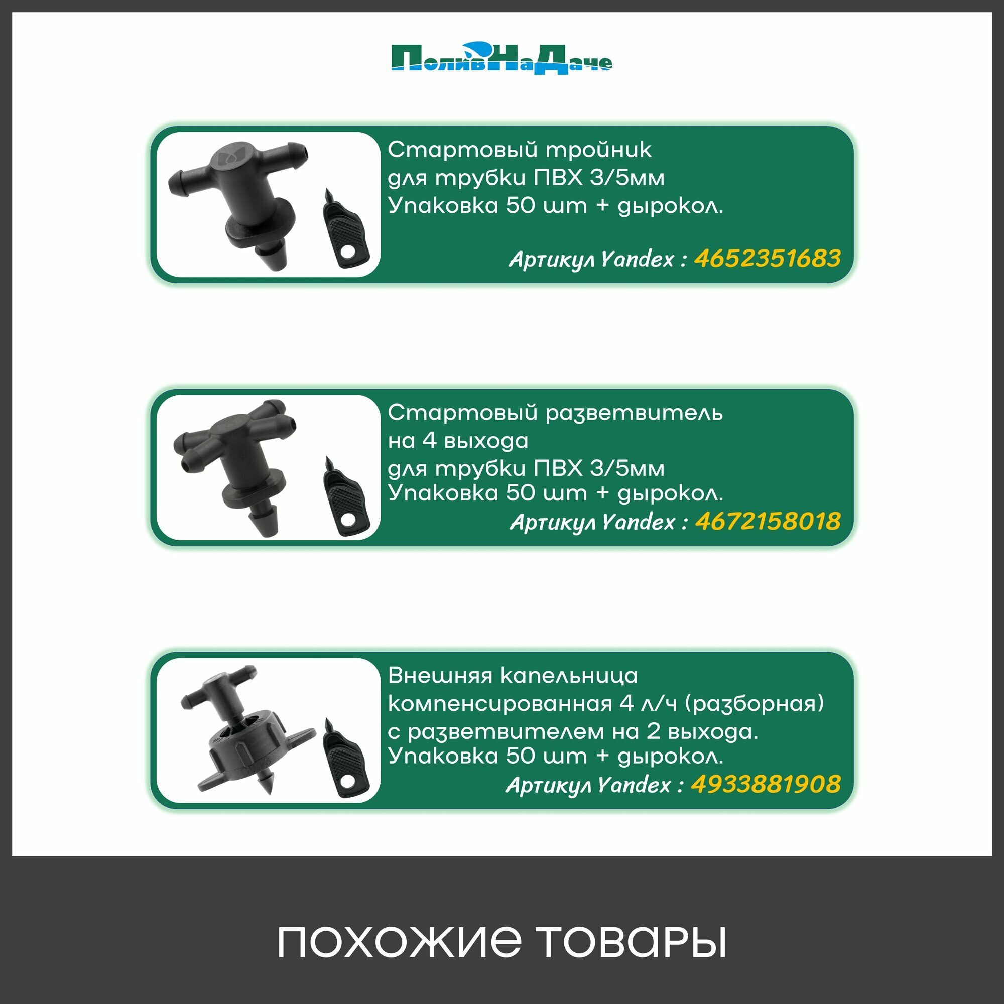 Внешняя капельница компенсированная 8 л/ч (разборная) с разветвителем на 4 выхода. Упаковка 50 шт + дырокол.