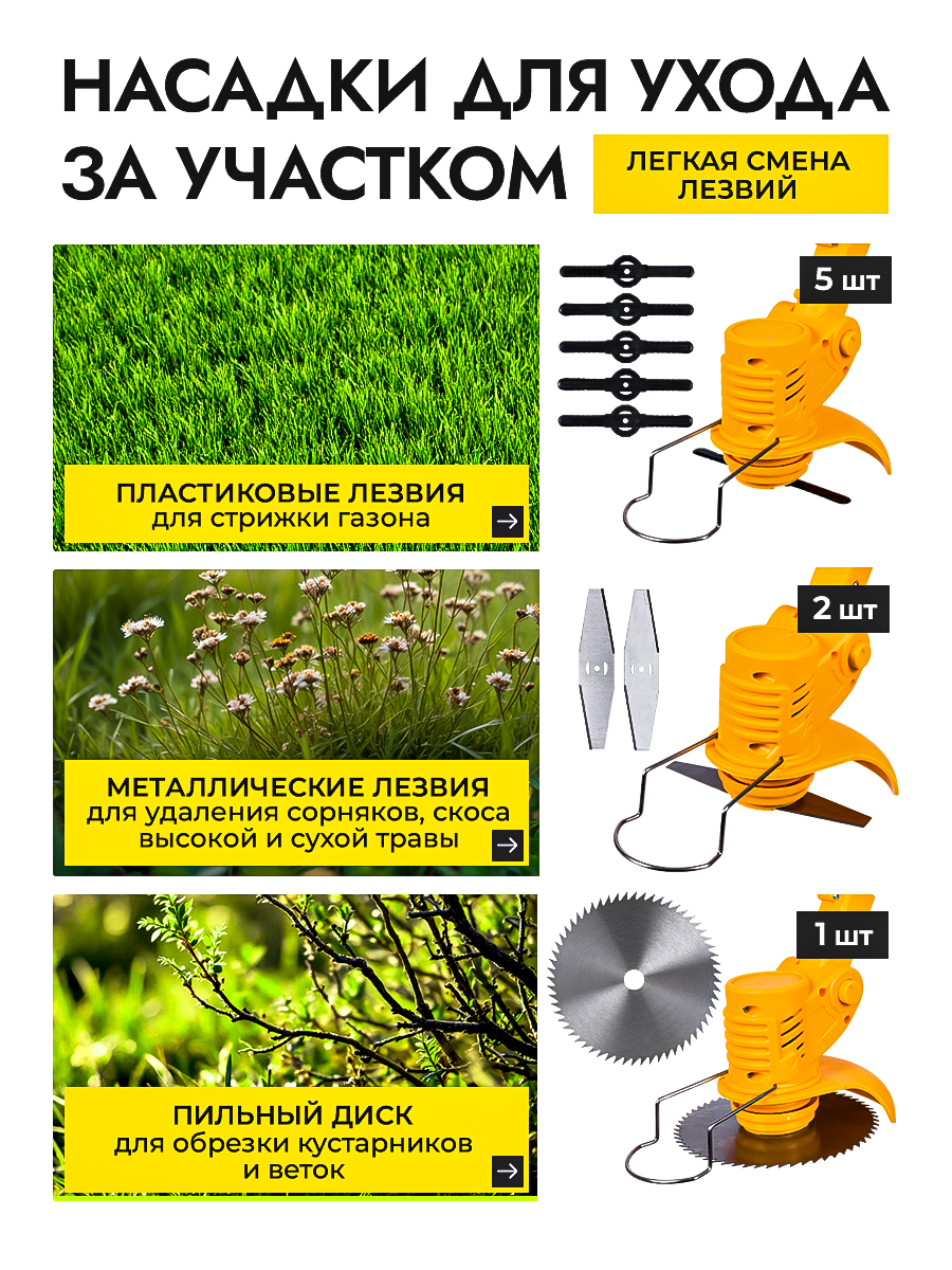 | Подробная комплектация | Триммер - 1 шт, Зарядное устройство 2 шт ; Пильный диск - 1 шт.; Пластиковые лезвия - 5 шт; Металлическое лезвие - 2 шт; Шестигранный ключ - 1 шт; Рукоятка - 1 шт; Аккумулятор - 1 шт |