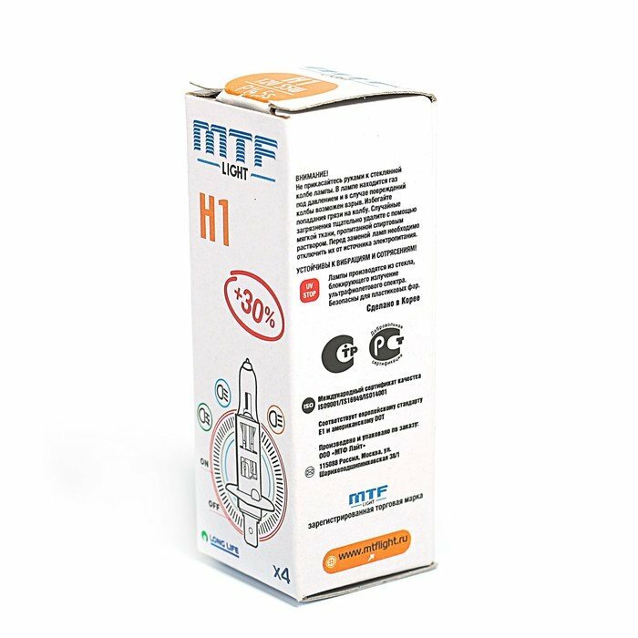 Лампа галоген 12v h1 55w p14.5s mtf longlife standart +30% 2900к