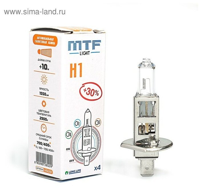 Купить Галогенная лампа MTF Light Long Life +30% H1 (12V/55W) 2900K