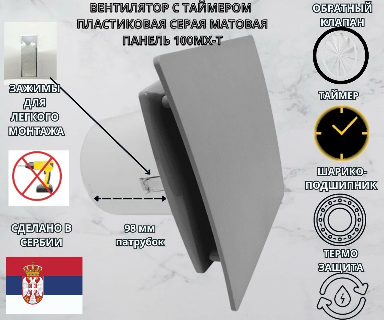 Вентилятор с таймером, D100мм, с пластиковой матовой серой панелью, с обратным клапаном и креплением без сверления A100МX-T, Сербия интересное: