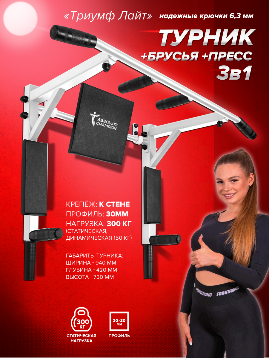 Турник настенный 3 в 1 брусья пресс тренажер для спорта дома, усиленный, нагрузка 300кг Триумф лайт белый с черными ручками интересное: