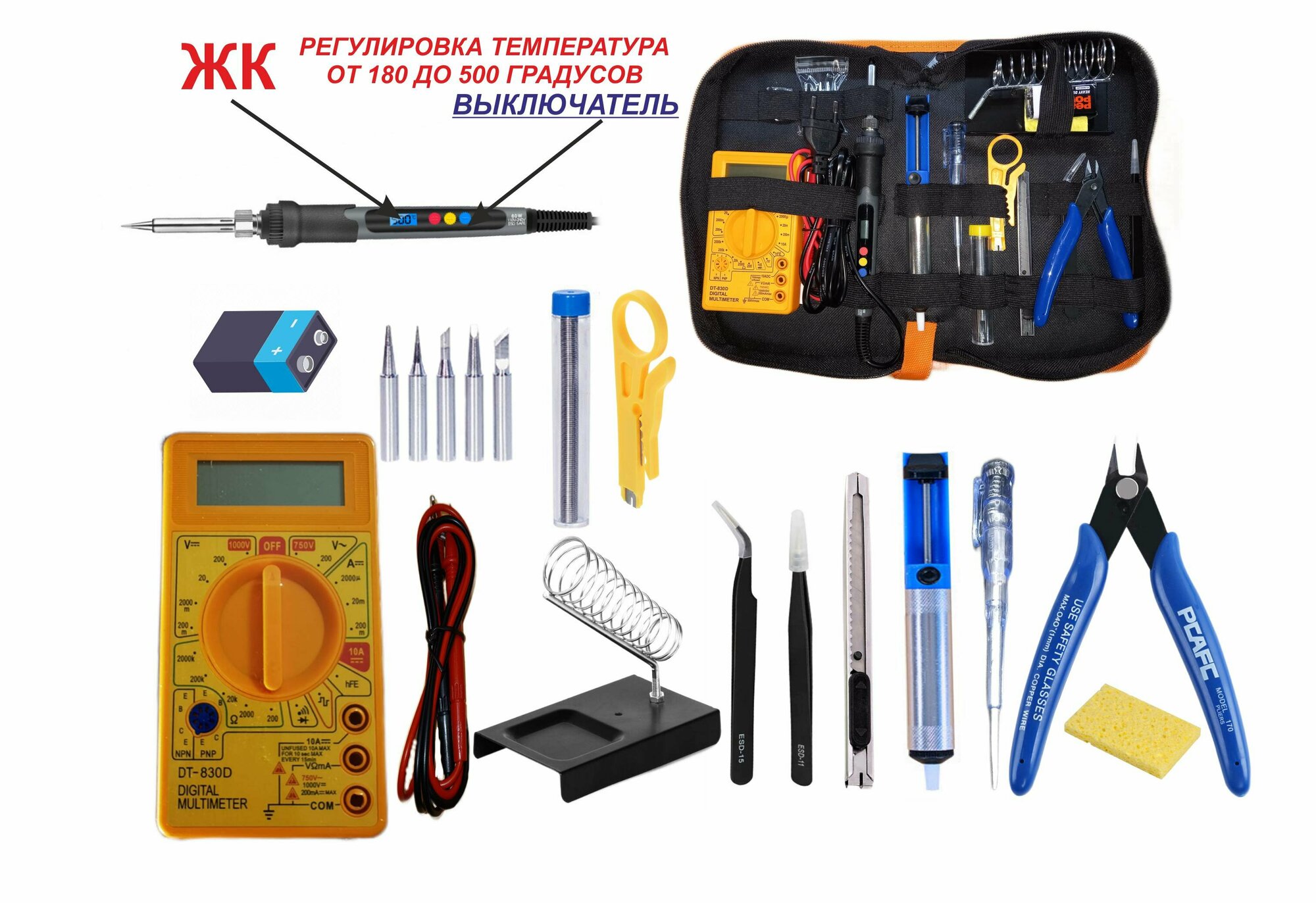 Набор №2-3, мультиметр DT-830D, цифровой паяльник, подставка, отвертка индикаторная, нож металл, припой, набор жал-5шт, оловоотсос, пинцеты, отвертка12в1