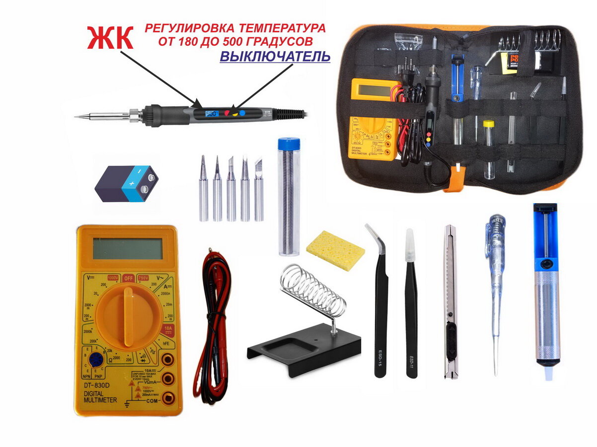 Набор №2-3, мультиметр DT-830D, цифровой паяльник, подставка, отвертка индикаторная, нож металл, припой, набор жал-5шт, оловоотсос, пинцеты, отвертка12в1