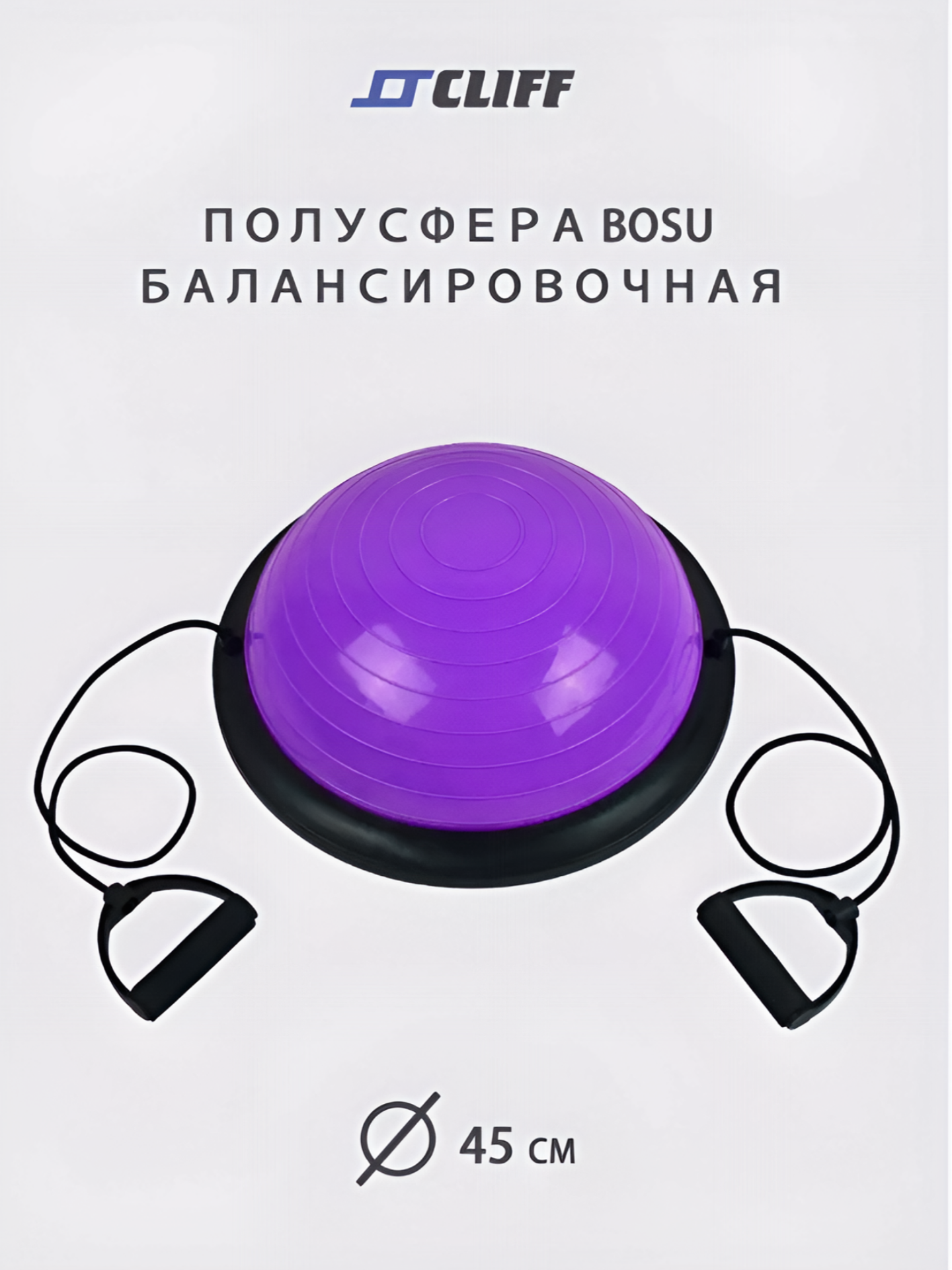 СохранитьПолусфера гимнастическая BOSU CLIFF 45*20см, фиолетовая, с эспандерами, с насосом, степ платформа. интересное: