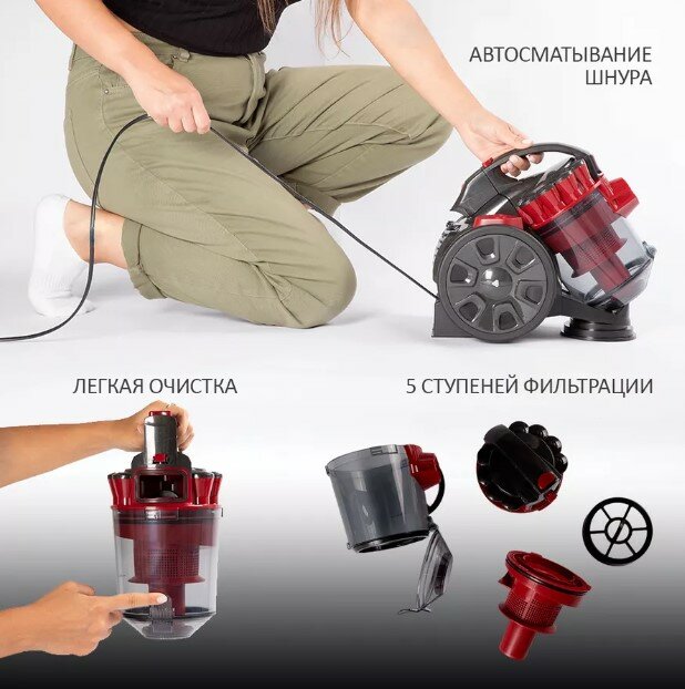 Пылесос, тихий бытовой пылесос, компактный передвижной пылесос, для дома, офиса,2600Вт, 1.5л, шнур 5 м, красный, черный, домашний, контейнер интересное: