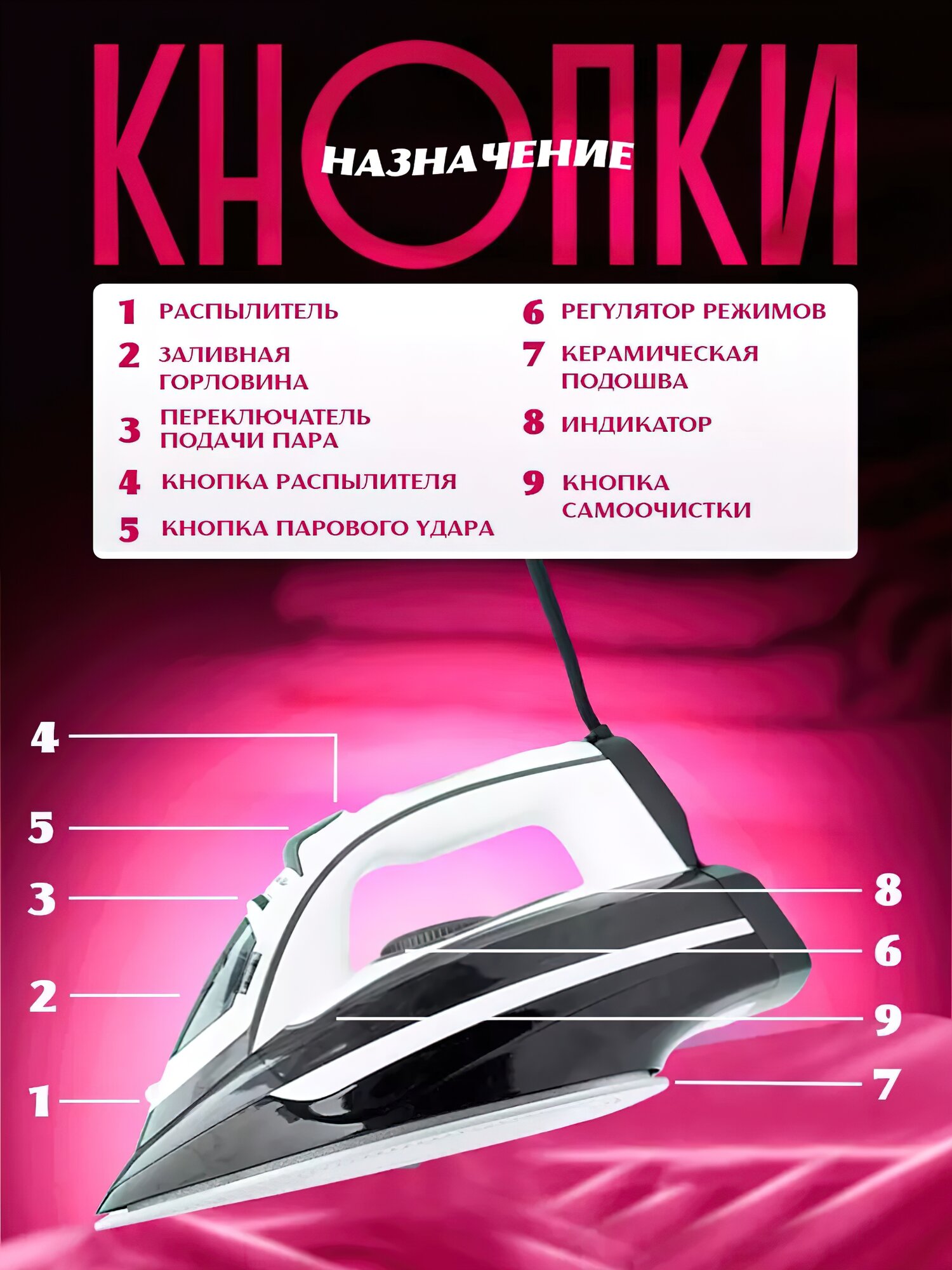 | Дополнительные функции | паровой удар / постоянная подача пара / регулировка подачи пара / система самоочистки / сухая глажка / функция разбрызгивания |
