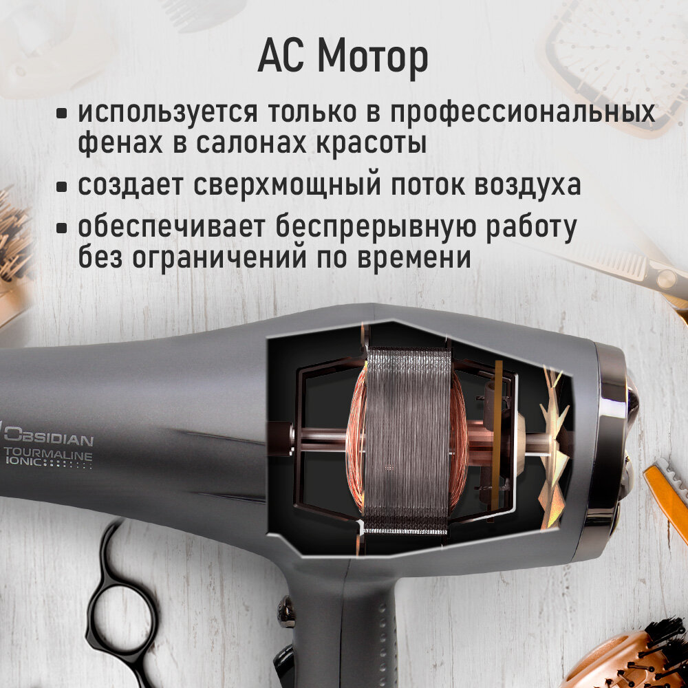 Купить Фен OBSIDIAN BS-HD504A PRO Профессиональный Технология tourmaline ionic (длина шнура электропитания 2.7 м) серый жемчуг, 2600 Вт