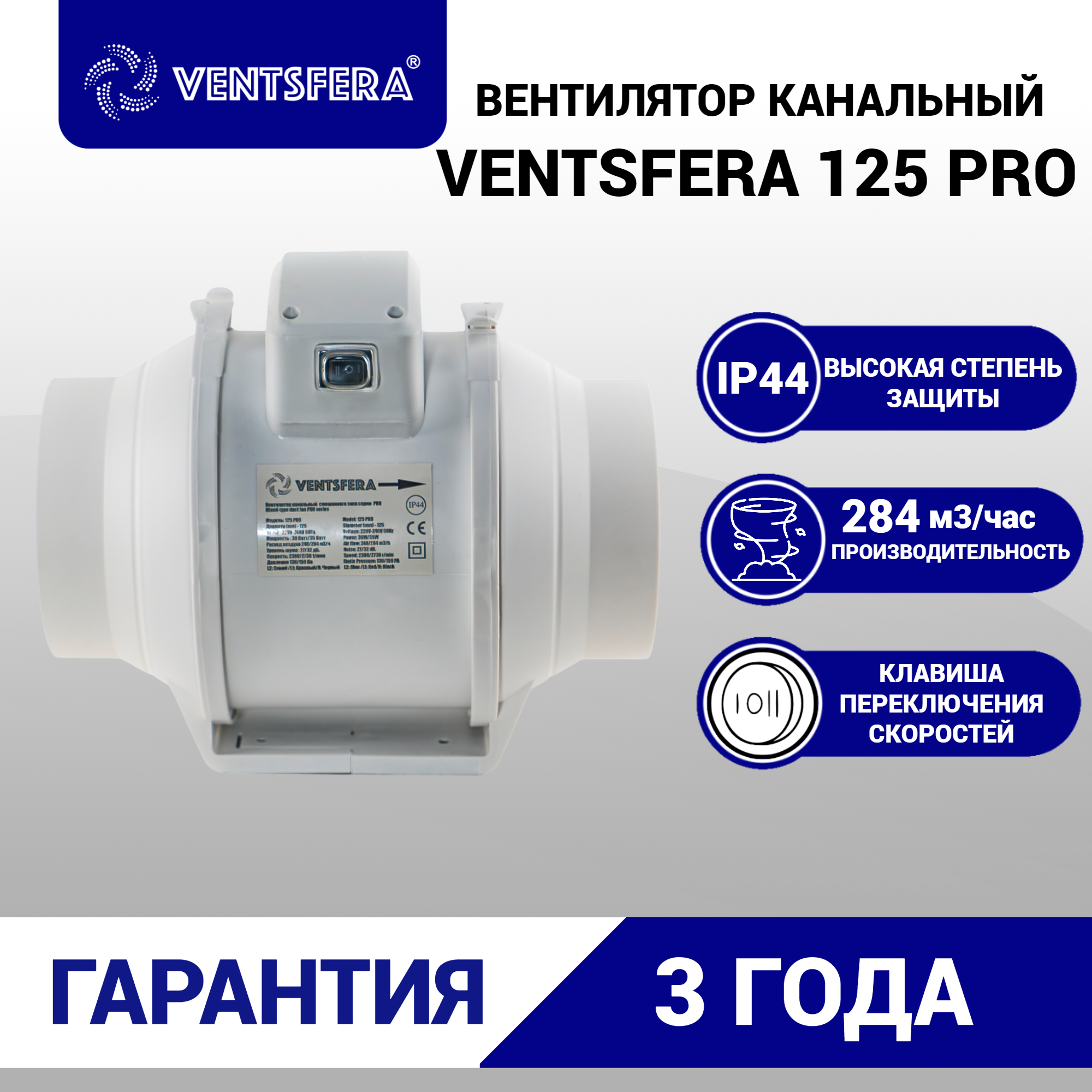 Вентилятор канальный VENTSFERA PRO D125мм двухскоростной осевой + кнопка на корпусе для переключения скоростей 284м3/ч интересное: