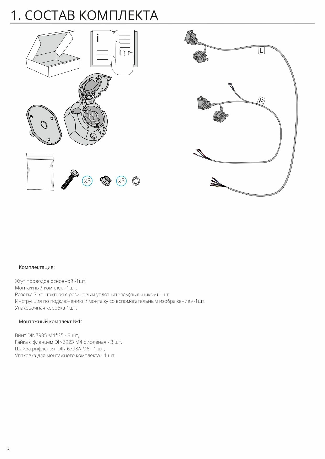| Подробная комплектация | - Жгут проводов со штатными колодками; - Розетка ТСУ 7 - контактная с защитным пыльником (ISO 1724); - Упаковочная коробка - 1шт; - Инструкция по подключению и монтажу со вспомогательными изображениями -1шт; - Монтажный комплект -1шт; (Винт DIN7985 М4*35 - 3 шт., Гайка с фланцем DIN6923 M4 рифленая - 3 шт.,Упаковка для монтажного комплекта- 1 шт.) |