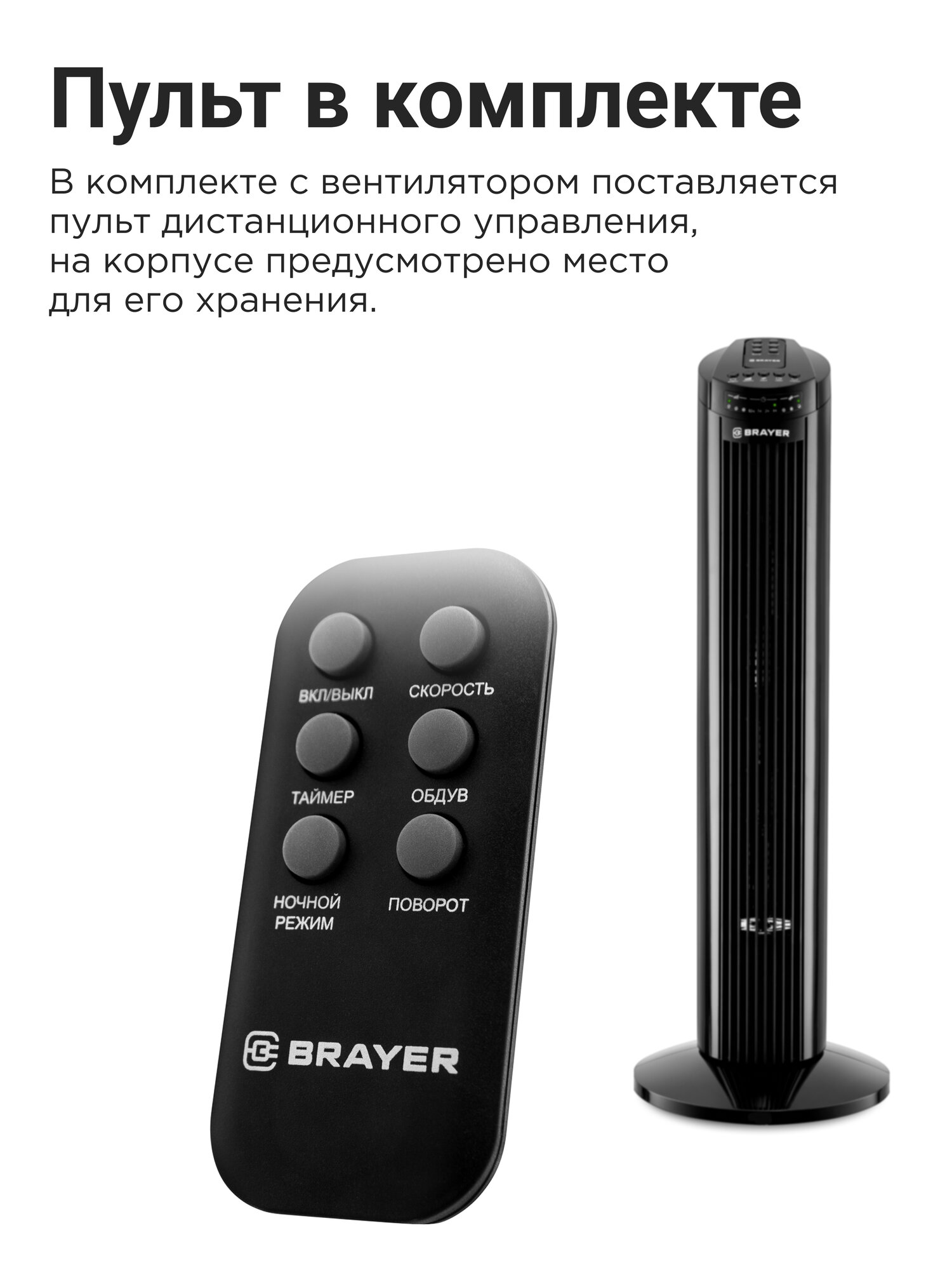 BRAYER BR4958BK Колонный вентилятор BRAYER, механ.упр.,пульт ДУ,вращение90°,мощ-ть50Вт,защита от перегрева