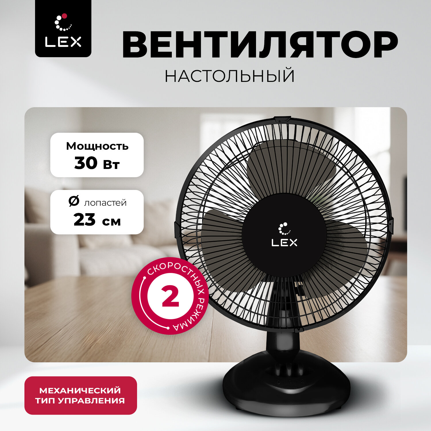 Вентилятор настольный LEX LXFC 8378, Мощность 30 Вт, размер лопастей 23 см, тип управления механический, 2 скорости вращения, поворот корпуса на 90*.