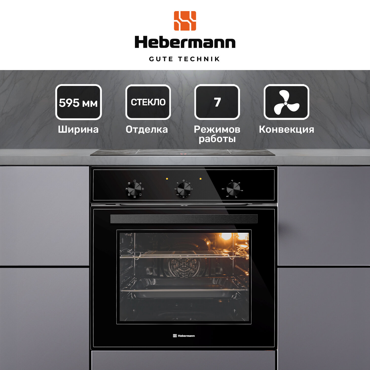 Духовой шкаф встраиваемый HBBO 6007.1 B, черный, усиленный гриль + конвекция, размораживание, 1 решетка и 1 глубокий противень, двойное стекло у дверцы, 7 режимов работы, размеры шкафа(В*Ш*Г)595*595*530 мм. отделка фасада-стекло.