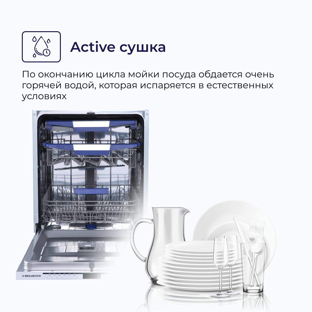 Посудомоечная машина встраиваемая 60 см DELVENTO VGB6602 / 6 программ / 14 комплектов посуды / Внутренняя подсветка / Класс A++ / Active сушка / Половинная загрузка / 3 ящика загрузки / Отдельный ящик для столовых приборов / LED дисплей