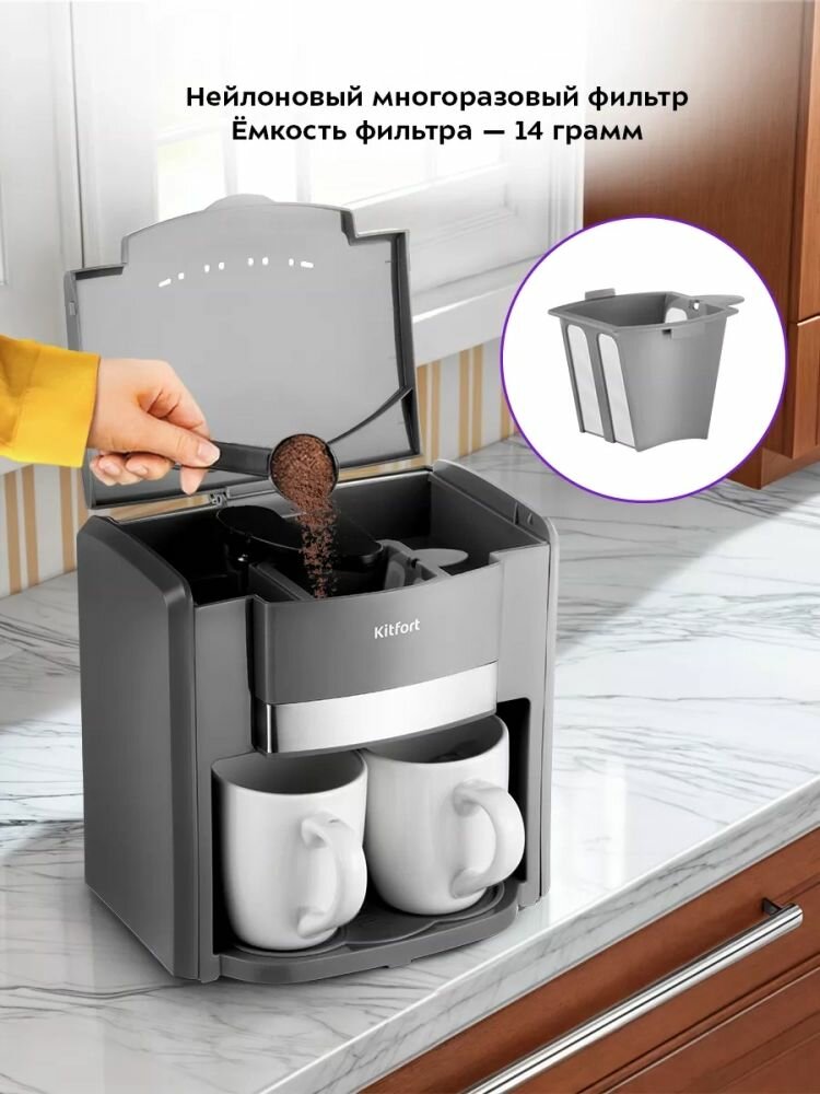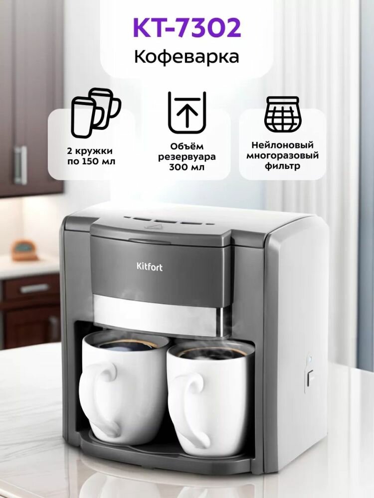 Кофеварка Kitfort КТ-764, капельная, мощность 450 Вт, на 0,25 л, с 2 чашками, черная