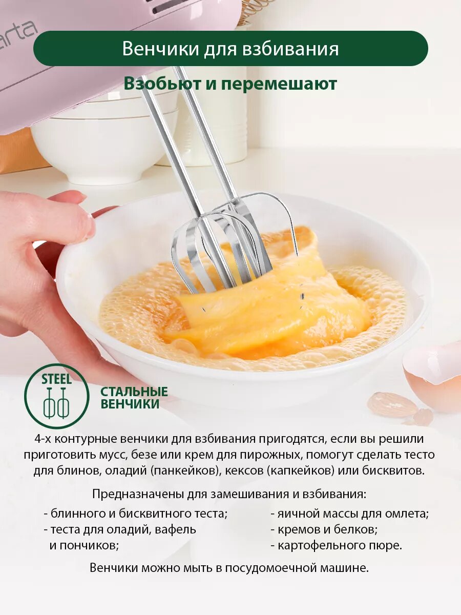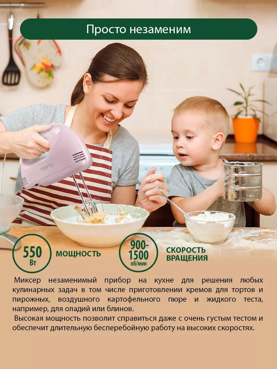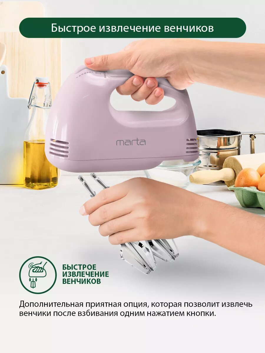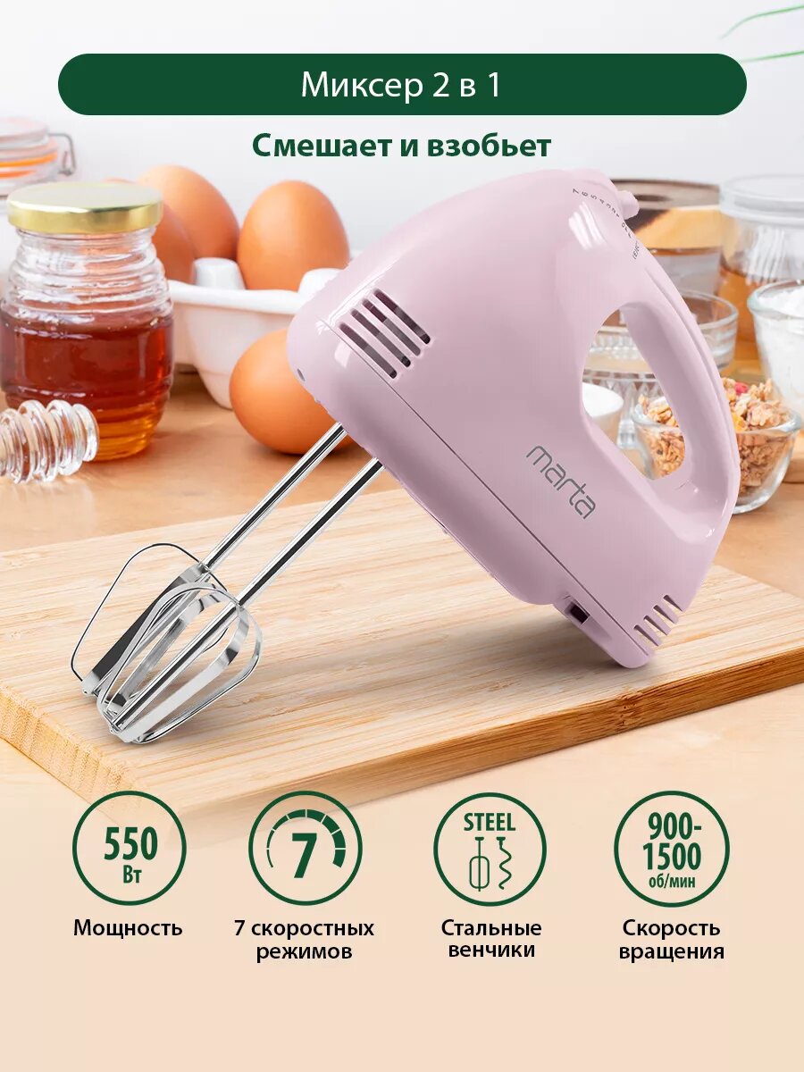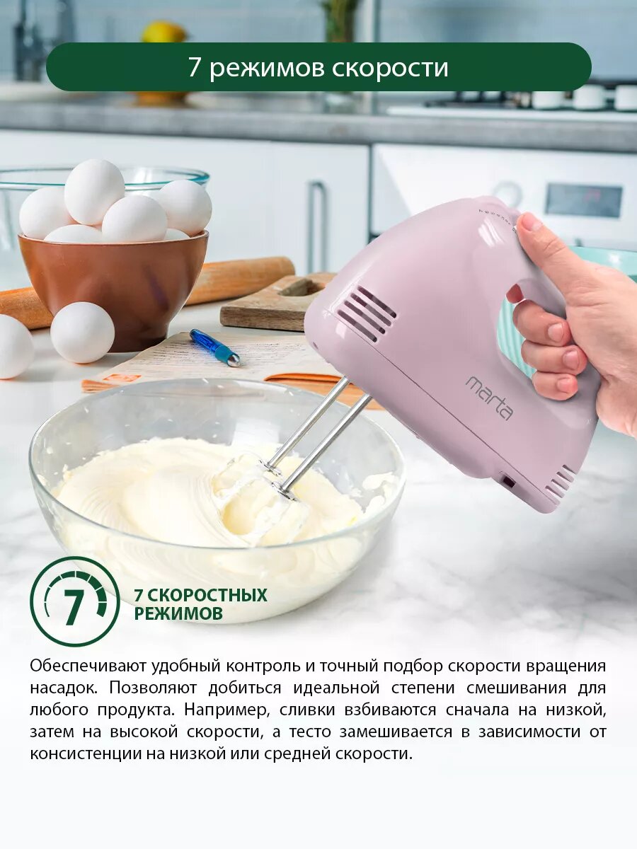 Миксер MARTA MT-MX1527, 550Вт, 7 скоростей, розовый, кнопка отсоединения интересное: