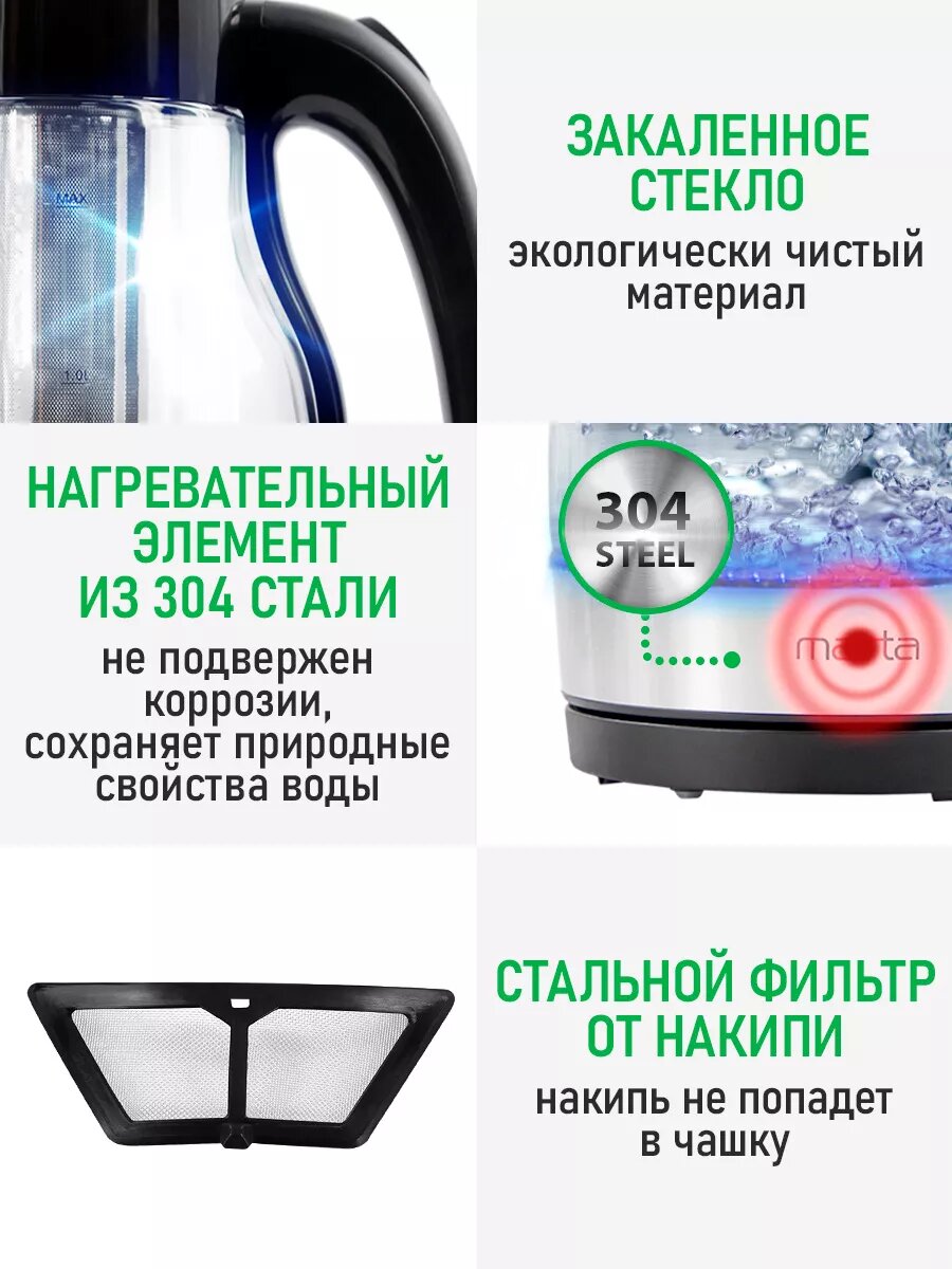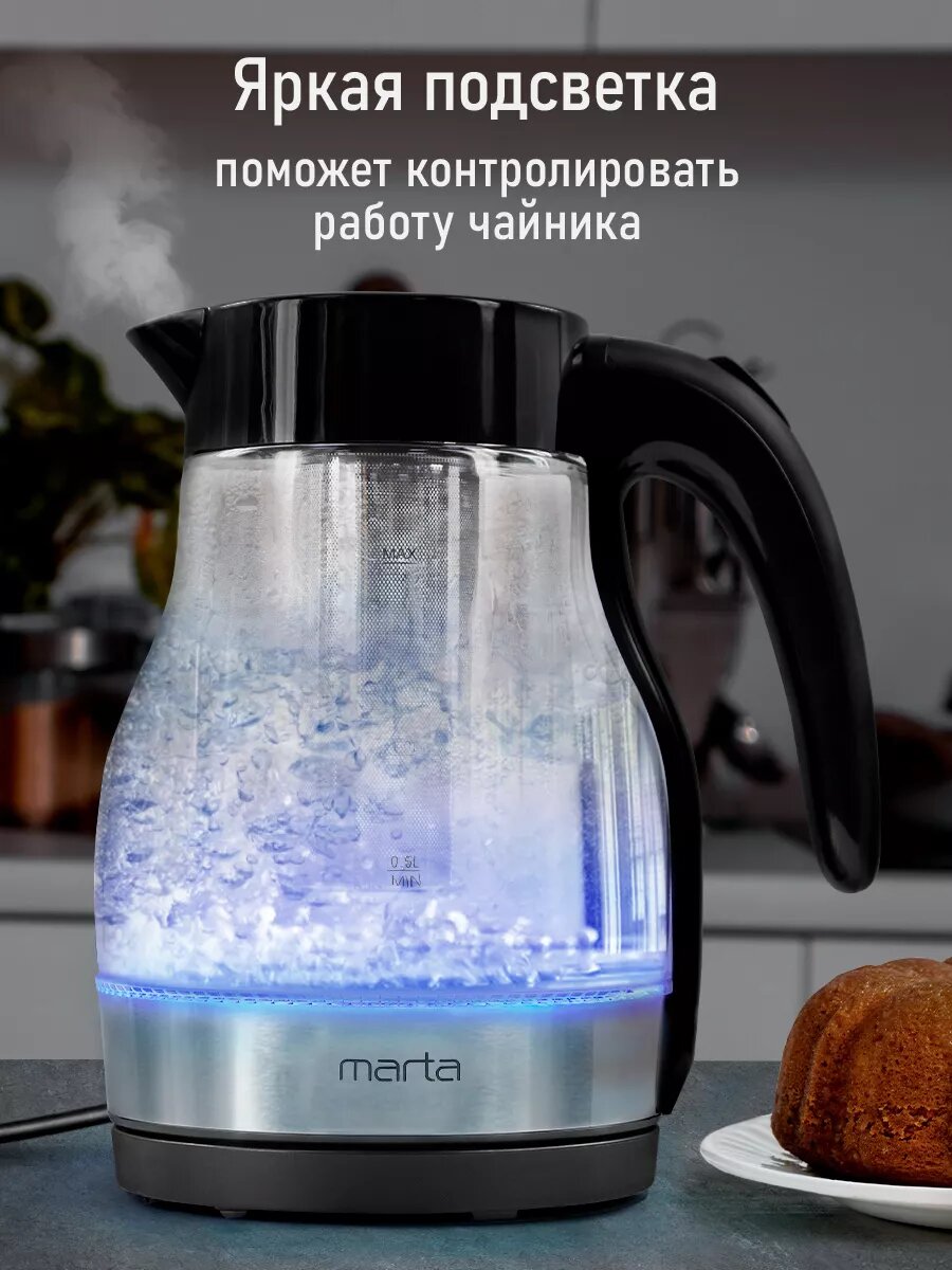 Электрический чайник MARTA MT-4640 черный стеклянный, с подсветкой 1,8 л интересное: