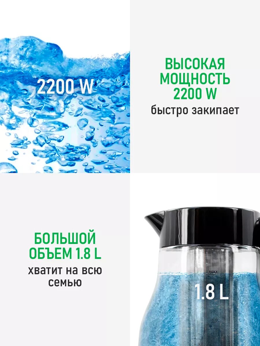 Чайник электрический стеклянный с подсветкой, 1,8 л