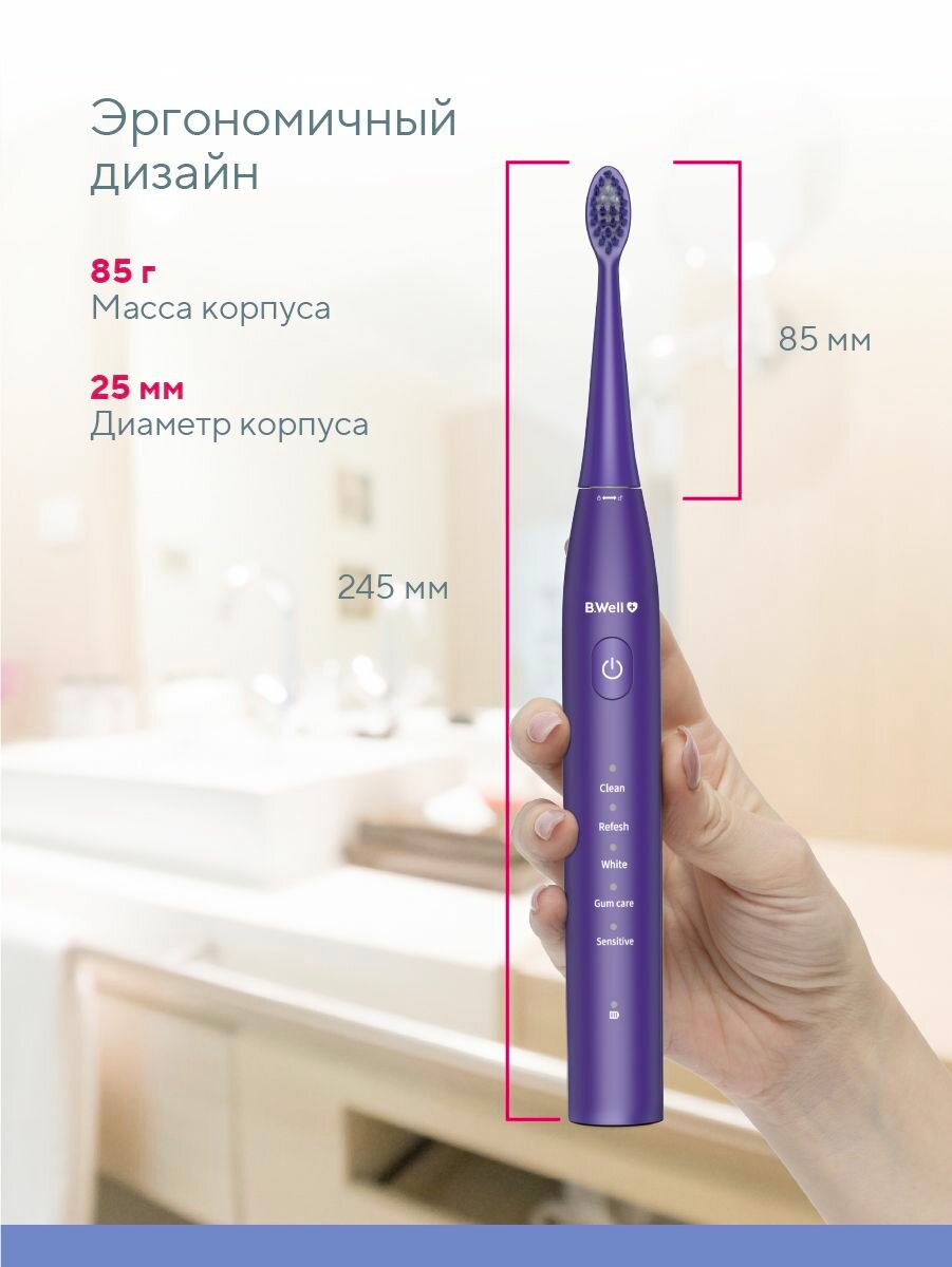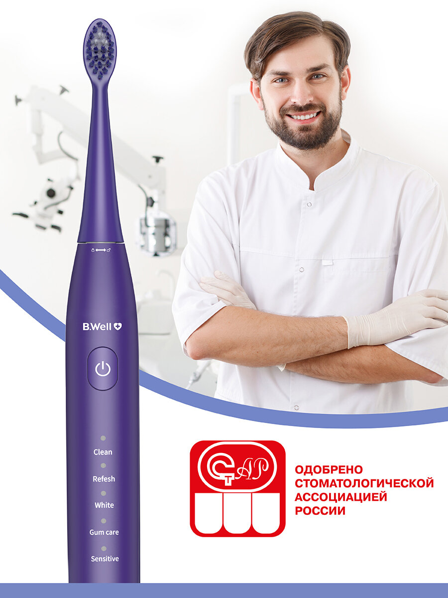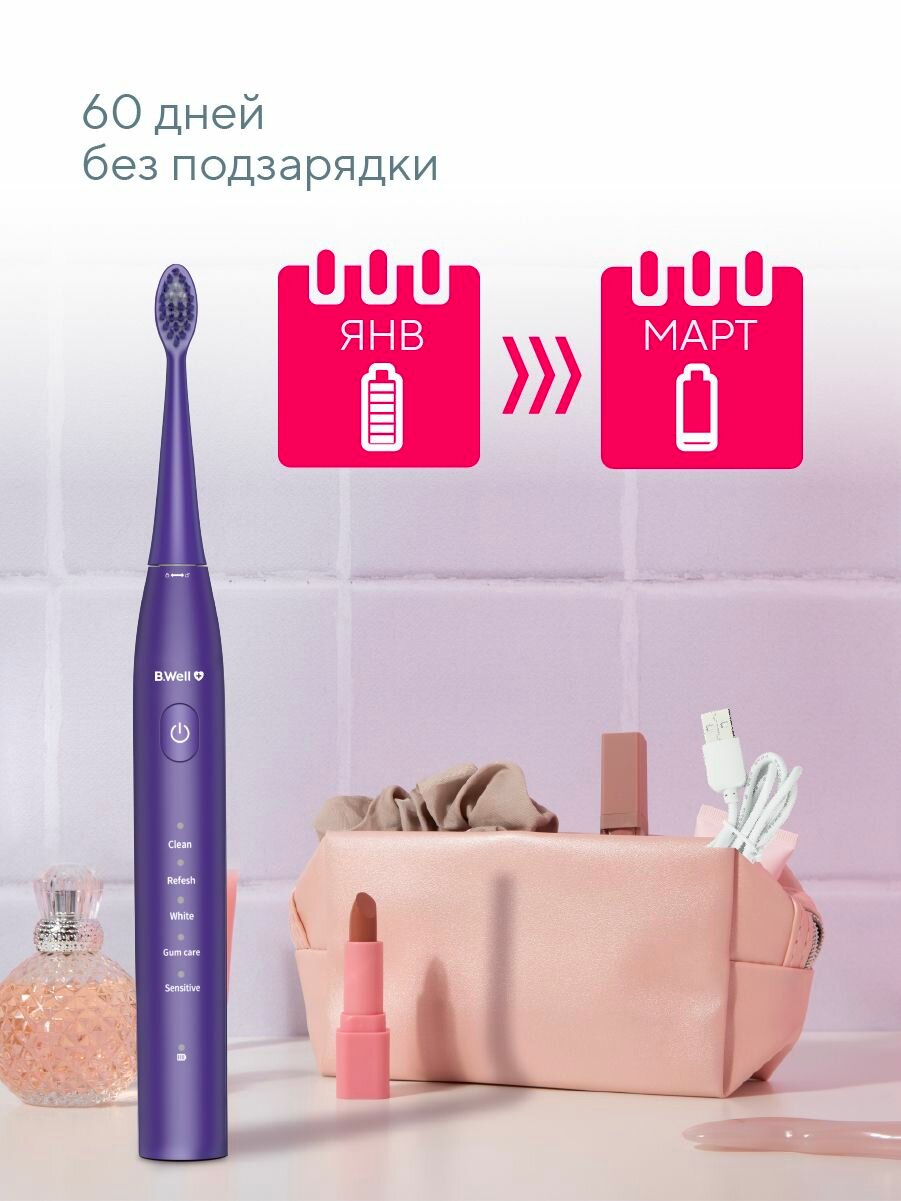 Купить Электрическая зубная щетка B.Well PRO-850 звуковая фиолетовая, 5 режимов, 60 дней без подзарядки