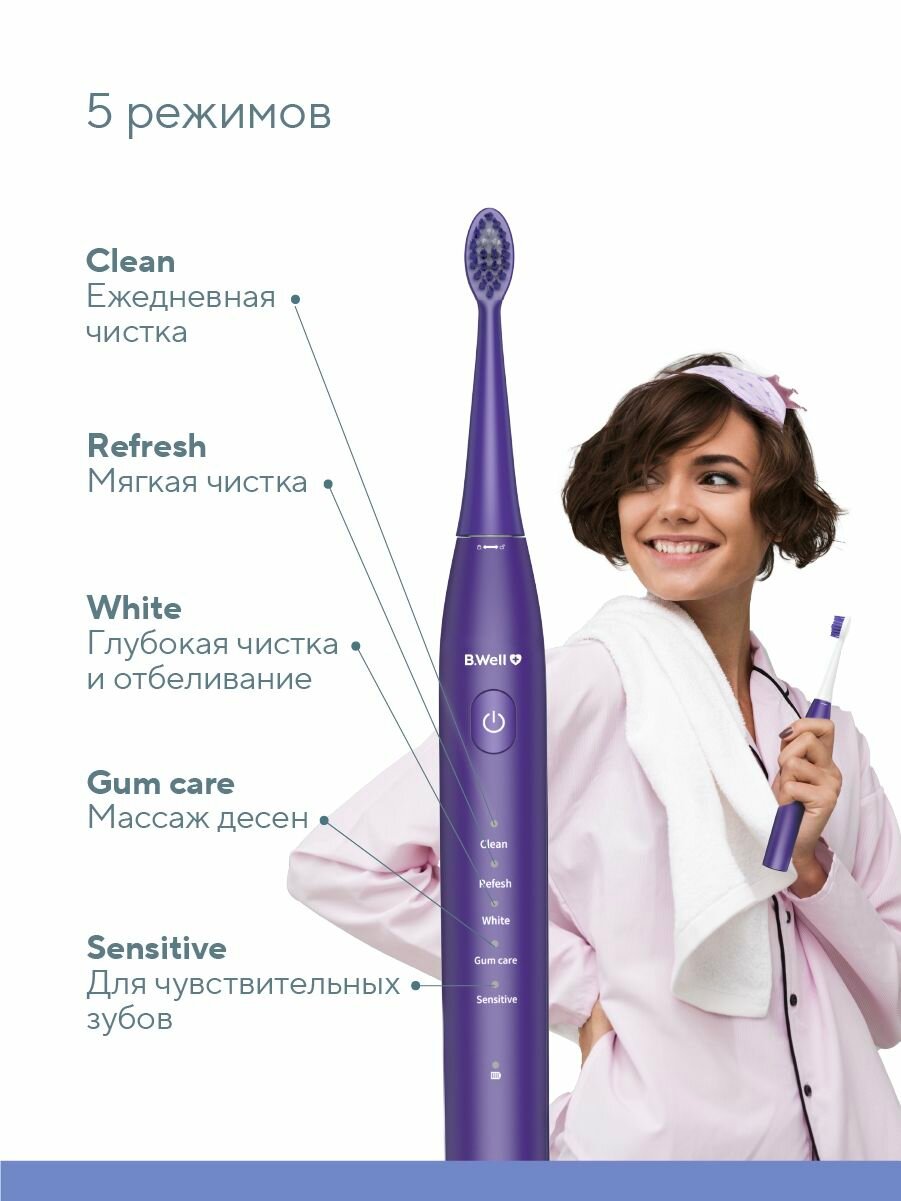 СохранитьЭлектрическая зубная щетка B.Well PRO-850 звуковая фиолетовая, 5 режимов, 60 дней без подзарядки интересное:
