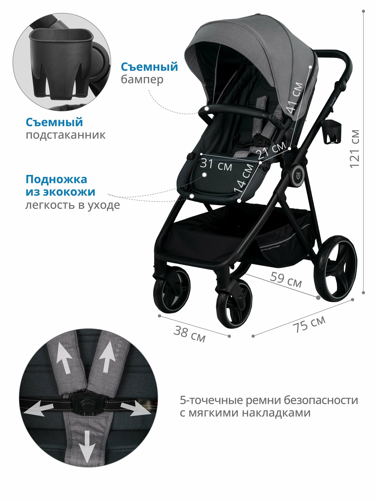 | Особенности | бампер, горизонтальное положение спинки, мягкие накладки на ремни, регулировка высоты подножки, регулировка наклона спинки, ремни безопасности, смотровое окно, съемный бампер |
