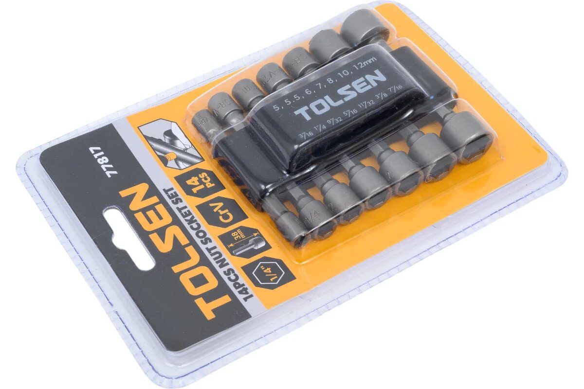 Купить TOLSEN Набор головок для шуруповерта шестигранных 1/4", 5-12 мм, 3/16"-7/16", 14 предметов 77817