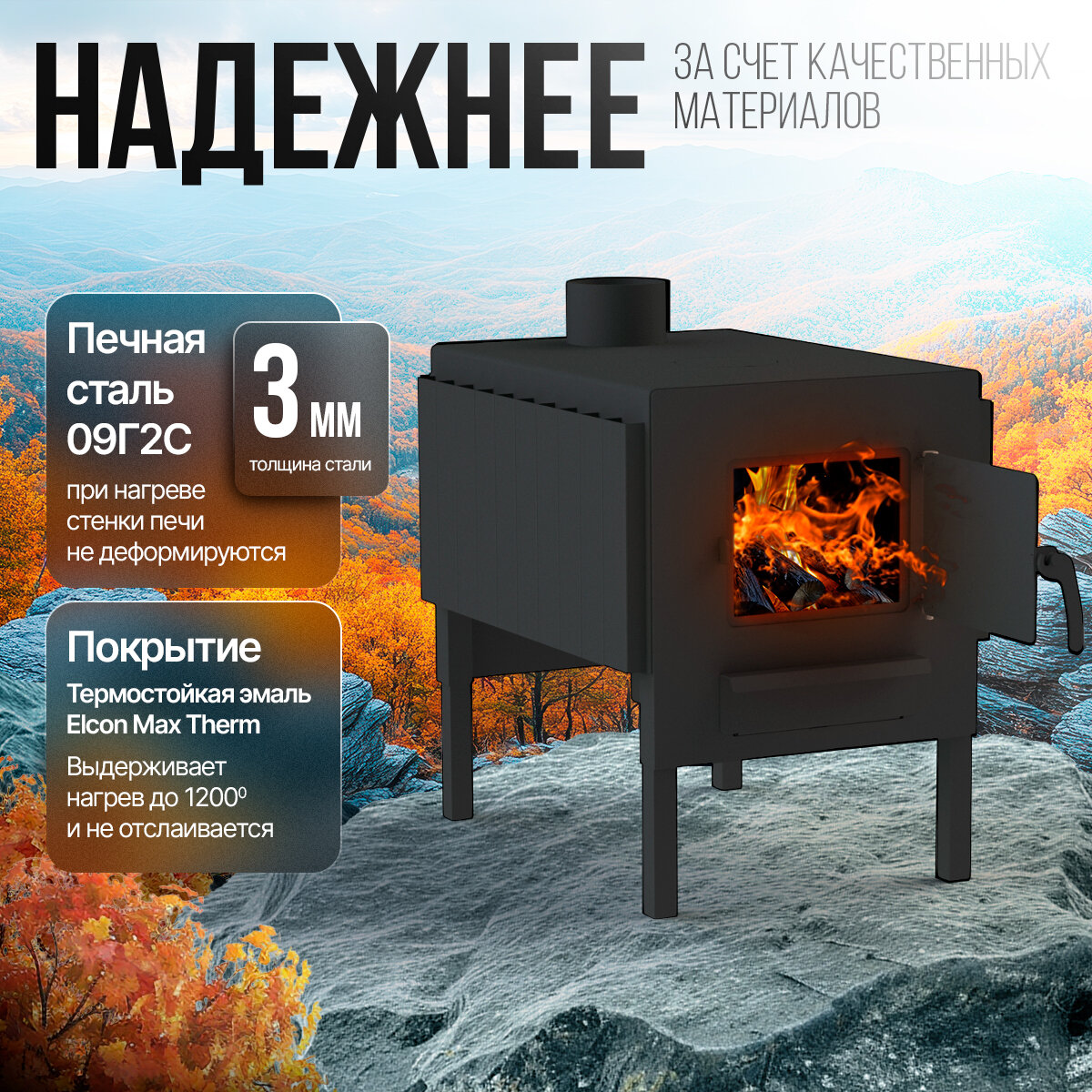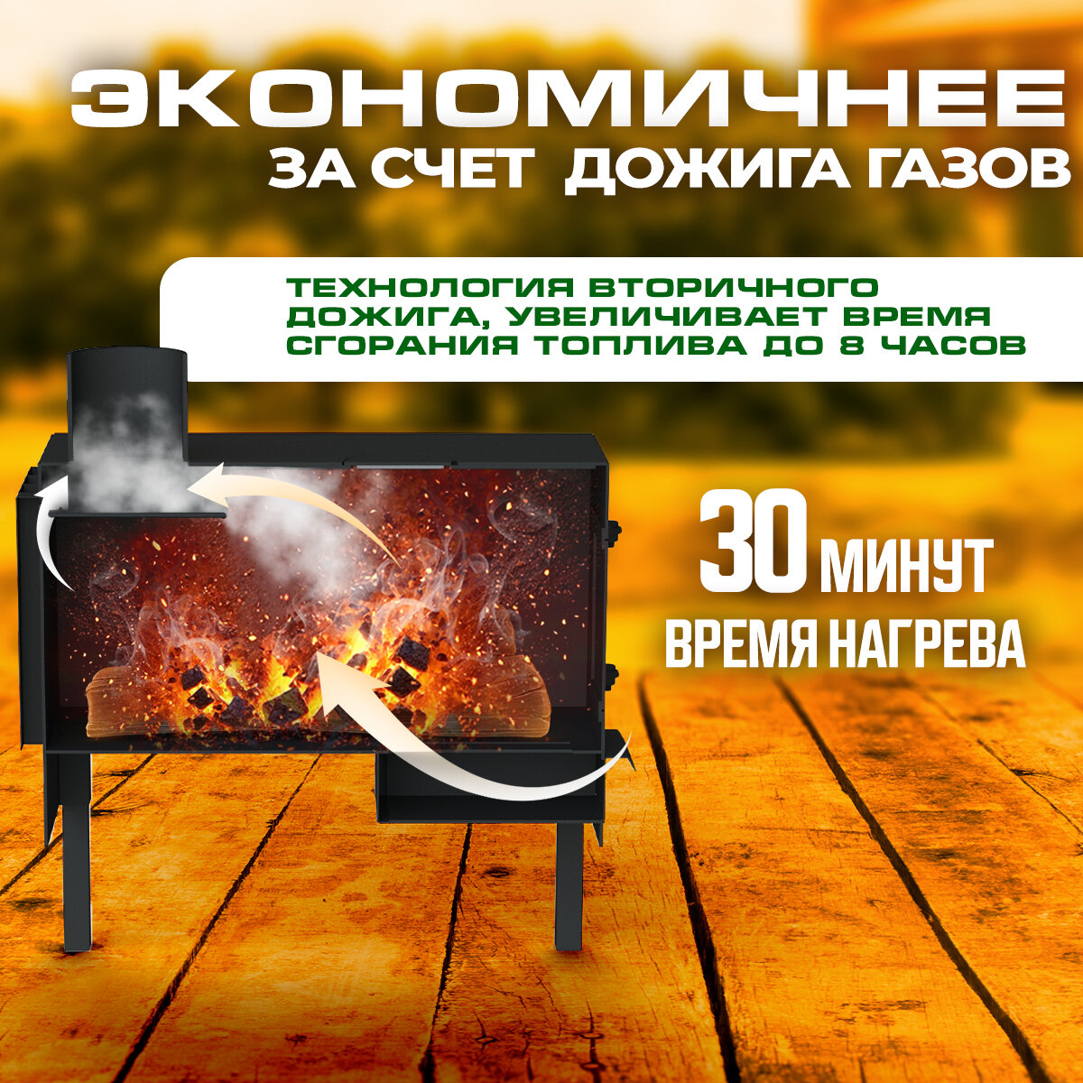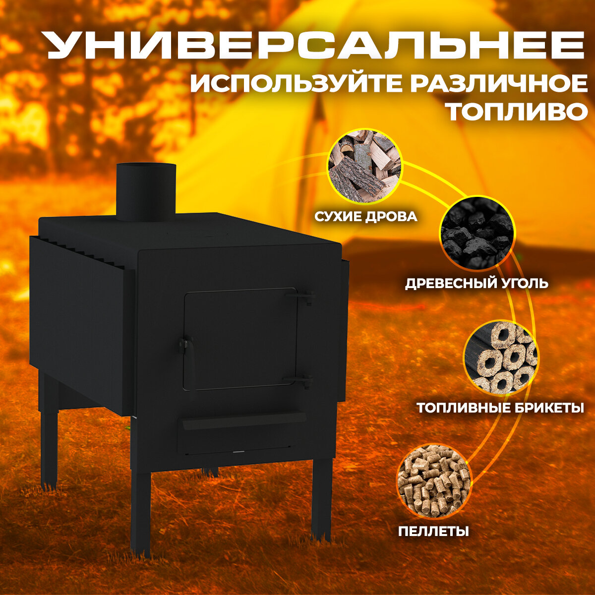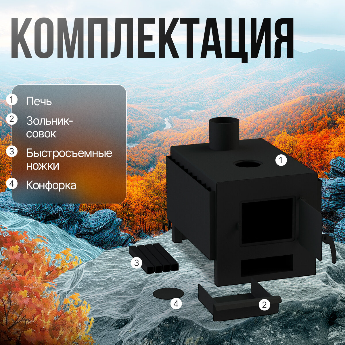 Буржуйка для гаража/дачи/дома, отопительная печь, 50м³, черная, с варочной панелью, 4кВт