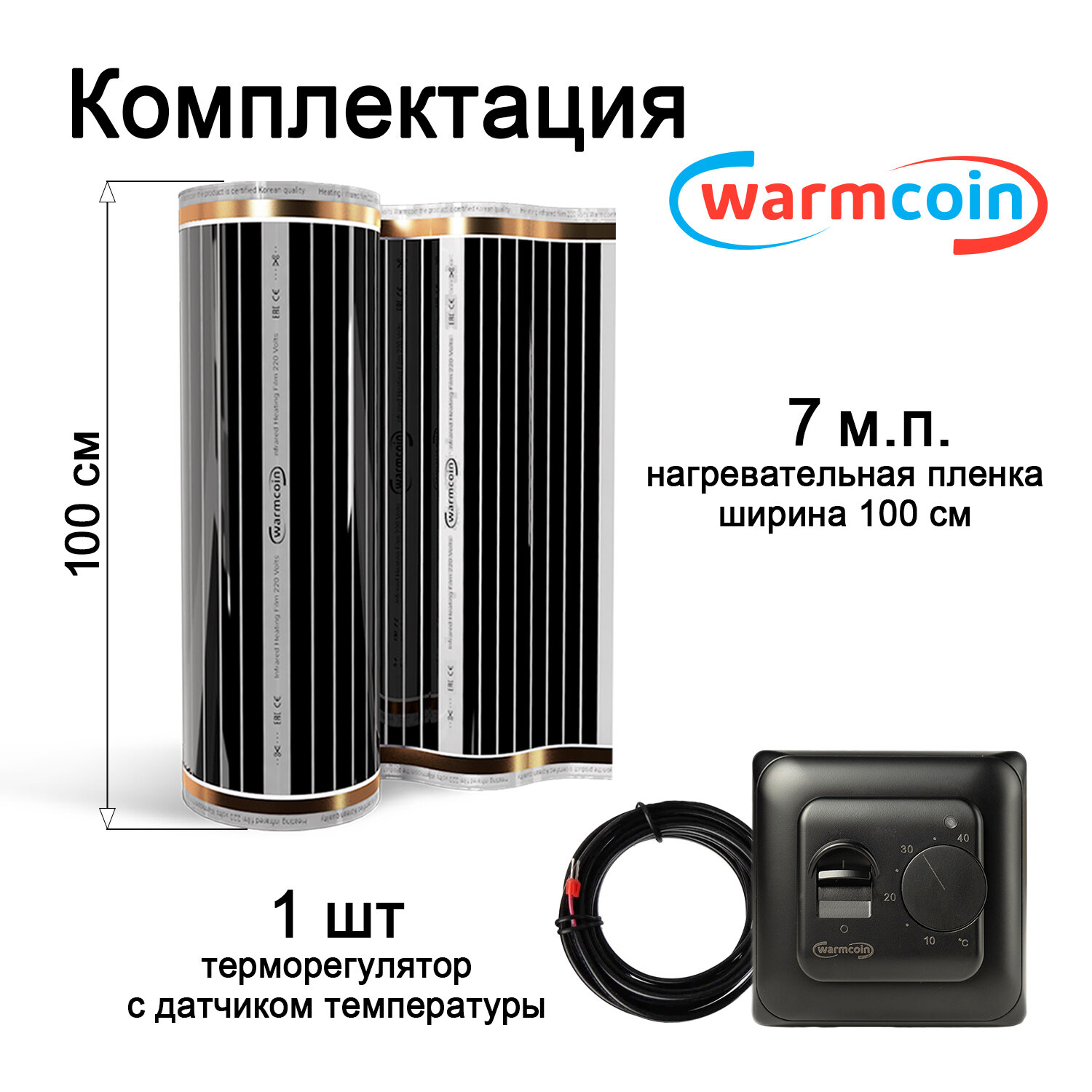 Теплый пол Warmcoin инфракрасный 100 см, 220 Вт/м.кв. с электронным терморегулятором, 7 м.п