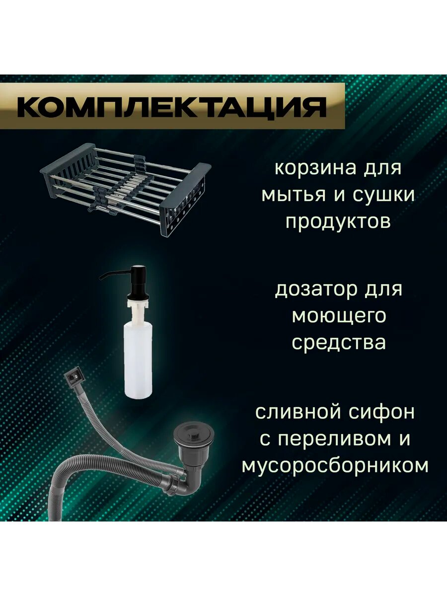 Мойка SIRIUSLINE Premium 60х45 из нержавеющей стали Графит SL6045G (в комплекте с коландером, врезным дозатором, и сифоном) толщина стали 3 мм