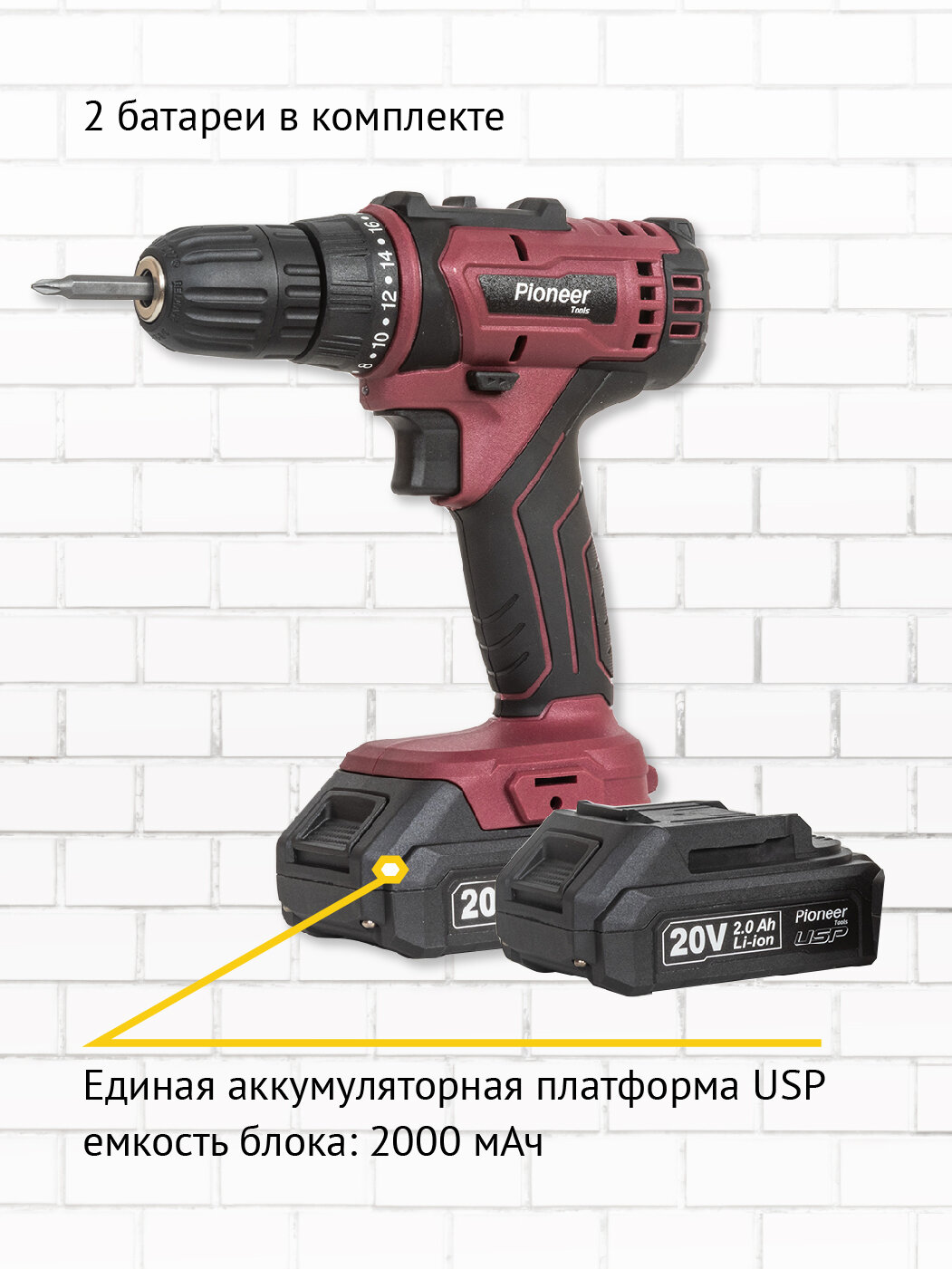 Дрель шуруповерт аккумуляторная Pioneer CD-M2002C_USP с единой аккумуляторной платформой USP, 2 скорости, реверс, 18 режимов, подсветка, 2 батареи, кейс