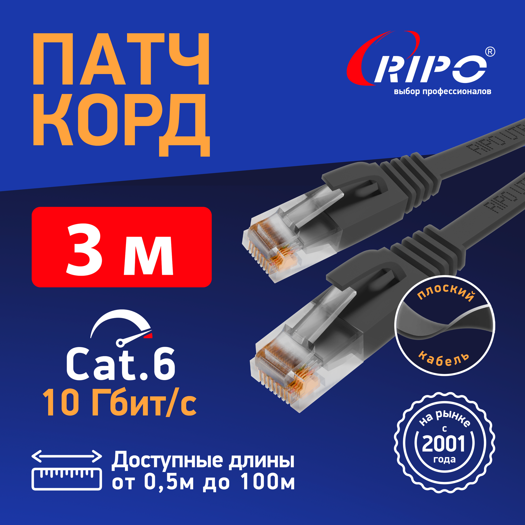 Купить Кабель для подключения интернета 3 м ютп4 кат6 лан провод интернет, патч корд плоский, витая пара UTP4 Cat6 RJ45 3 метра RIPO ССА черный 003-300139