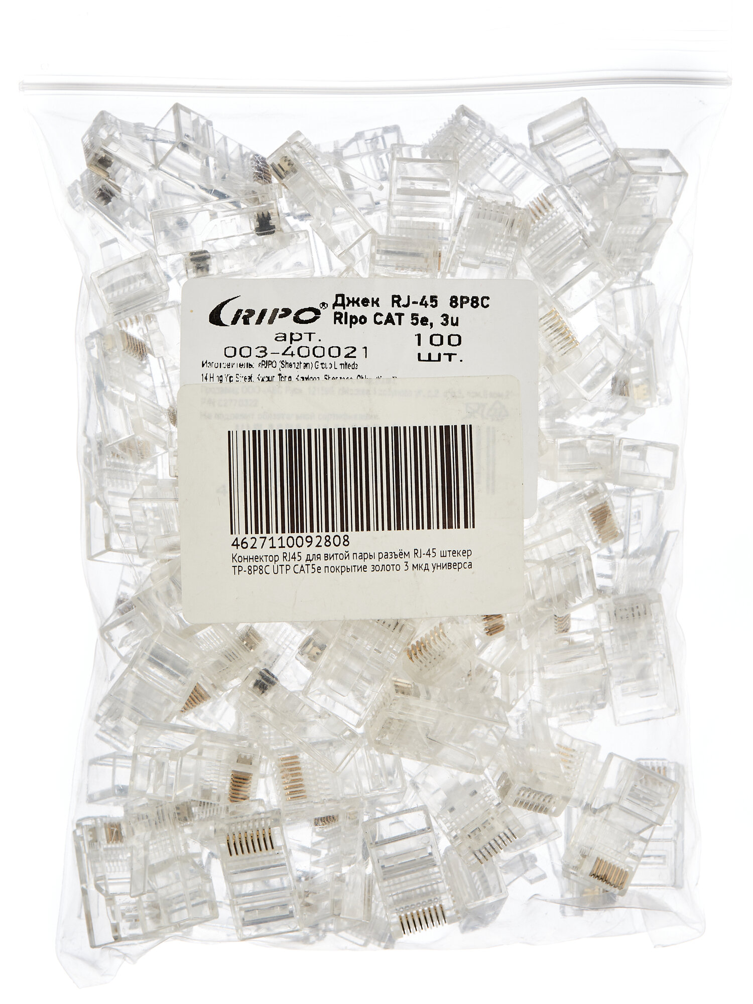 Купить Коннектор RJ45 для витой пары разъём RJ-45 штекер TP-8P8C UTP CAT5e покрытие золото 3 мкд универсальные ножи Ripo 100 шт в упаковке 003-400021