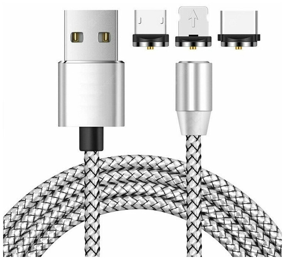 Купить Кабель Магнитный зарядки 3-в-1 (microUSB + type-C + Lightning)для iPhone/Xiaomi/Samsung/1001 мм, Серебристый