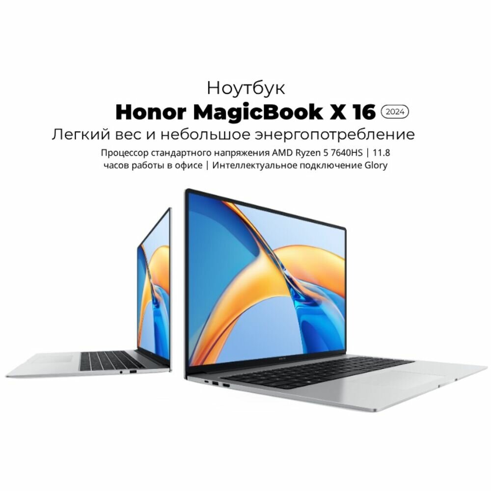 16" Ноутбук Honor MagicBook X16, BRN-H56 1920x1200 IPS, AMD Ryzen 5 7640HS (4.3 ГГц), RAM 16 ГБ LPDDR5, SSD 1024 ГБ, AMD Radeon 760M, Windows 11 Pro + MS Office 2021 Pro, Серебристый, Русская раскладка