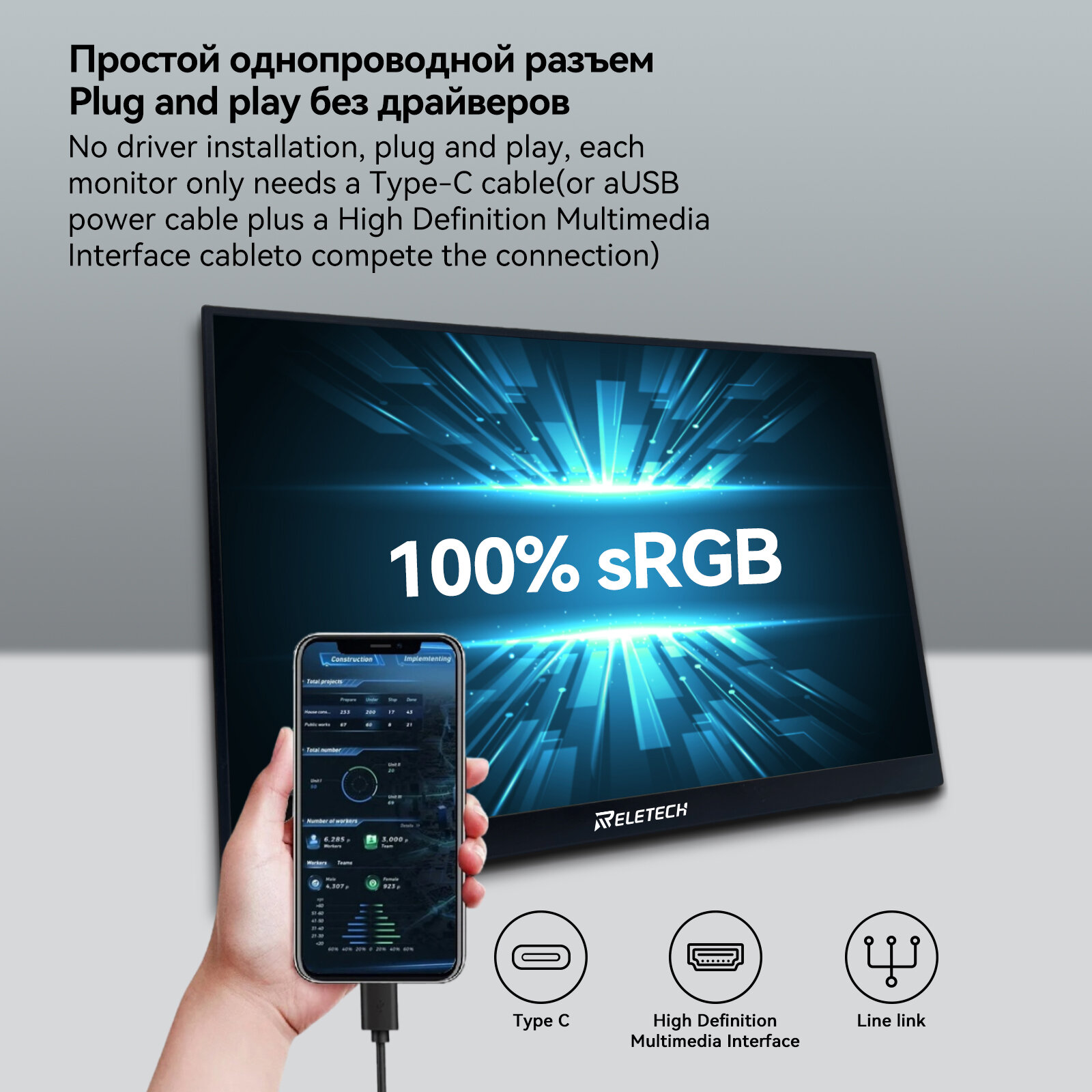 Reletech 16-дюймовый портативный монитор 1600P 2.5K игровой дисплей для коммутатора Steam Deck PS5 Xbox