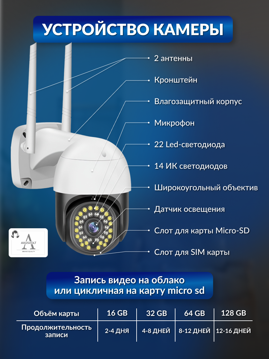 Умная 4G камера видеонаблюдения AXUSVOLT, 5МП, для дома и улицы, ночная съемка, работает от сим-карты, функция домофон, датчик движения интересное: