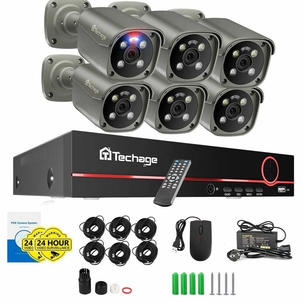 Купить Готовые комплекты видеонаблюдения Techage, 6 камер, 4K, IP66