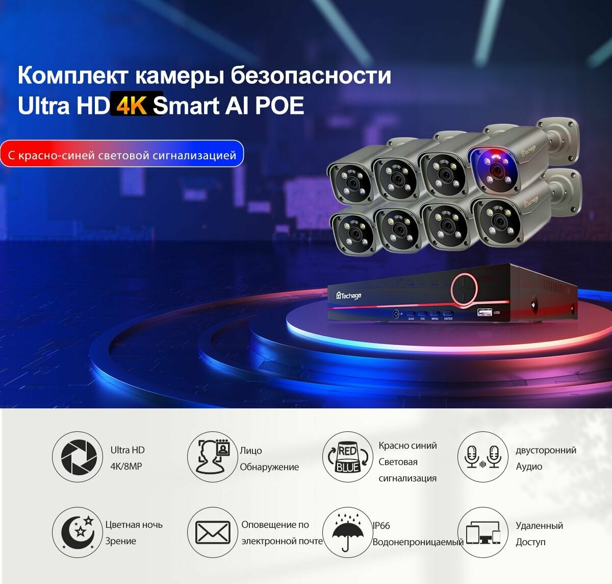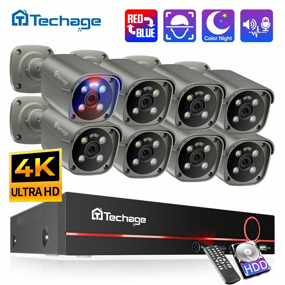 Готовые комплекты видеонаблюдения Techage, 6 камер, 4K, IP66