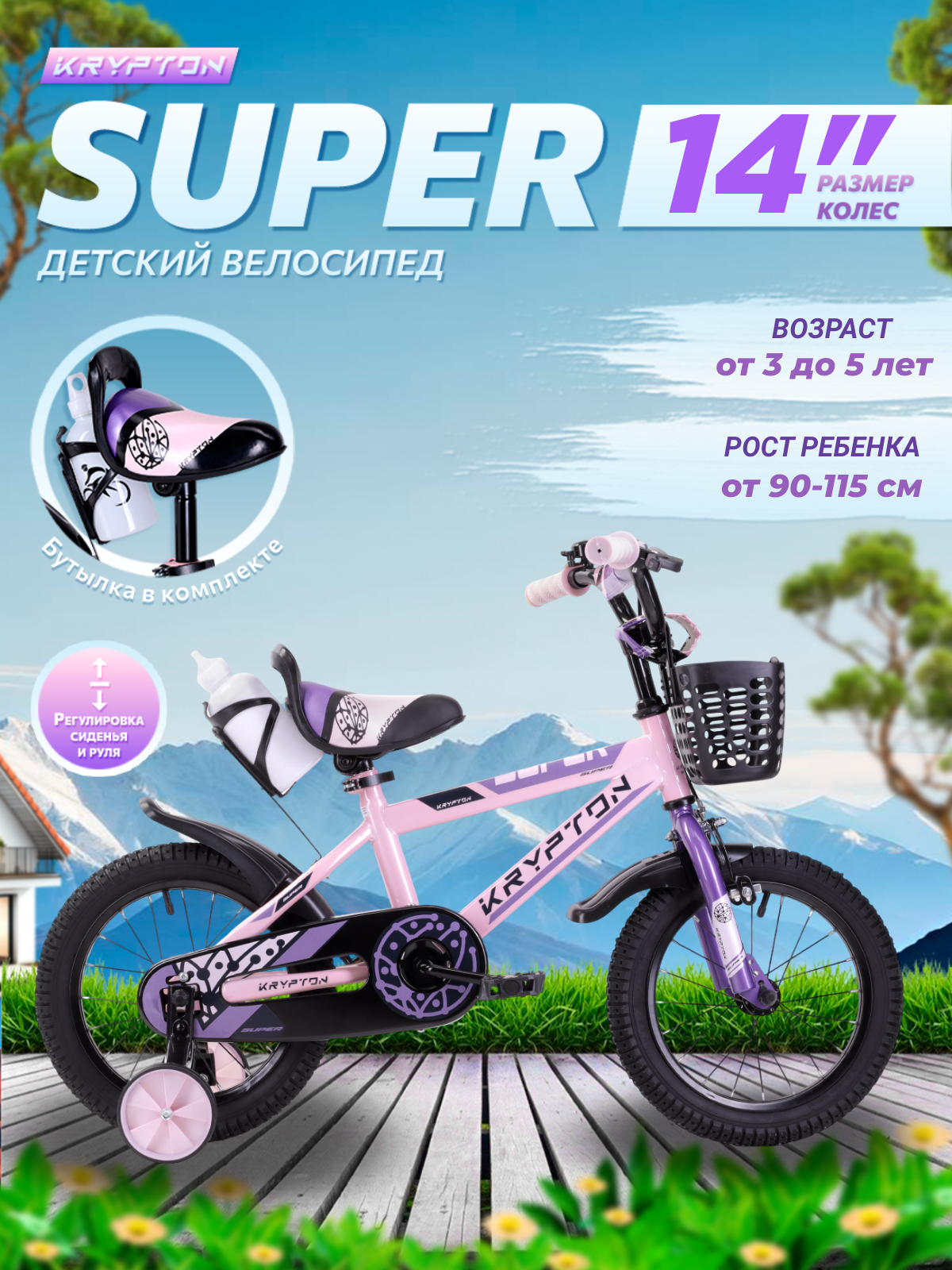 Купить Велосипед детский двухколесный 14" KRYPTON SUPER lilac pink / на 3-5 лет, рост 90-115см
