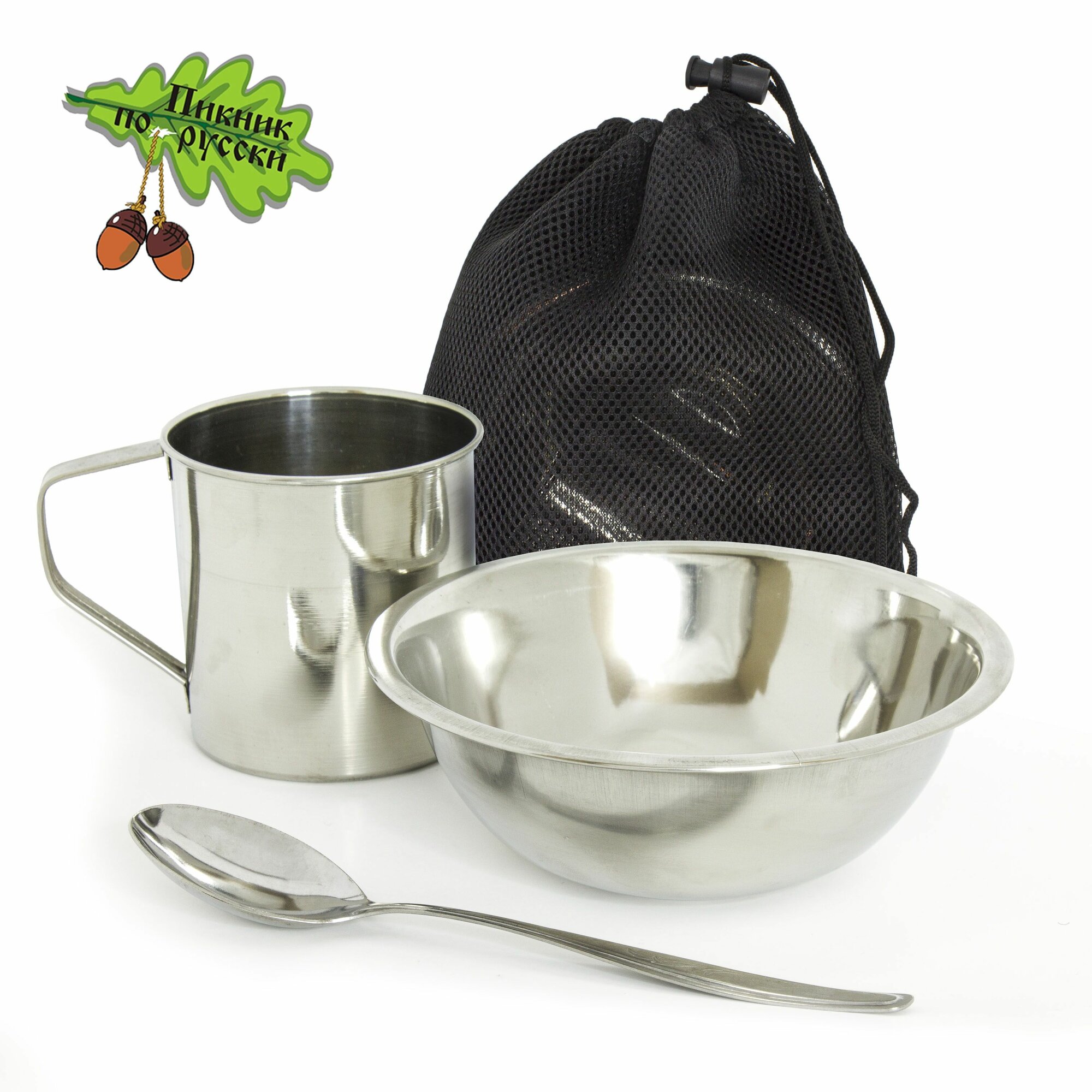 Набор посуды туристический Пикник по русски / набор посуды из нержавейки с мешком , синиий для туризма и отдыха