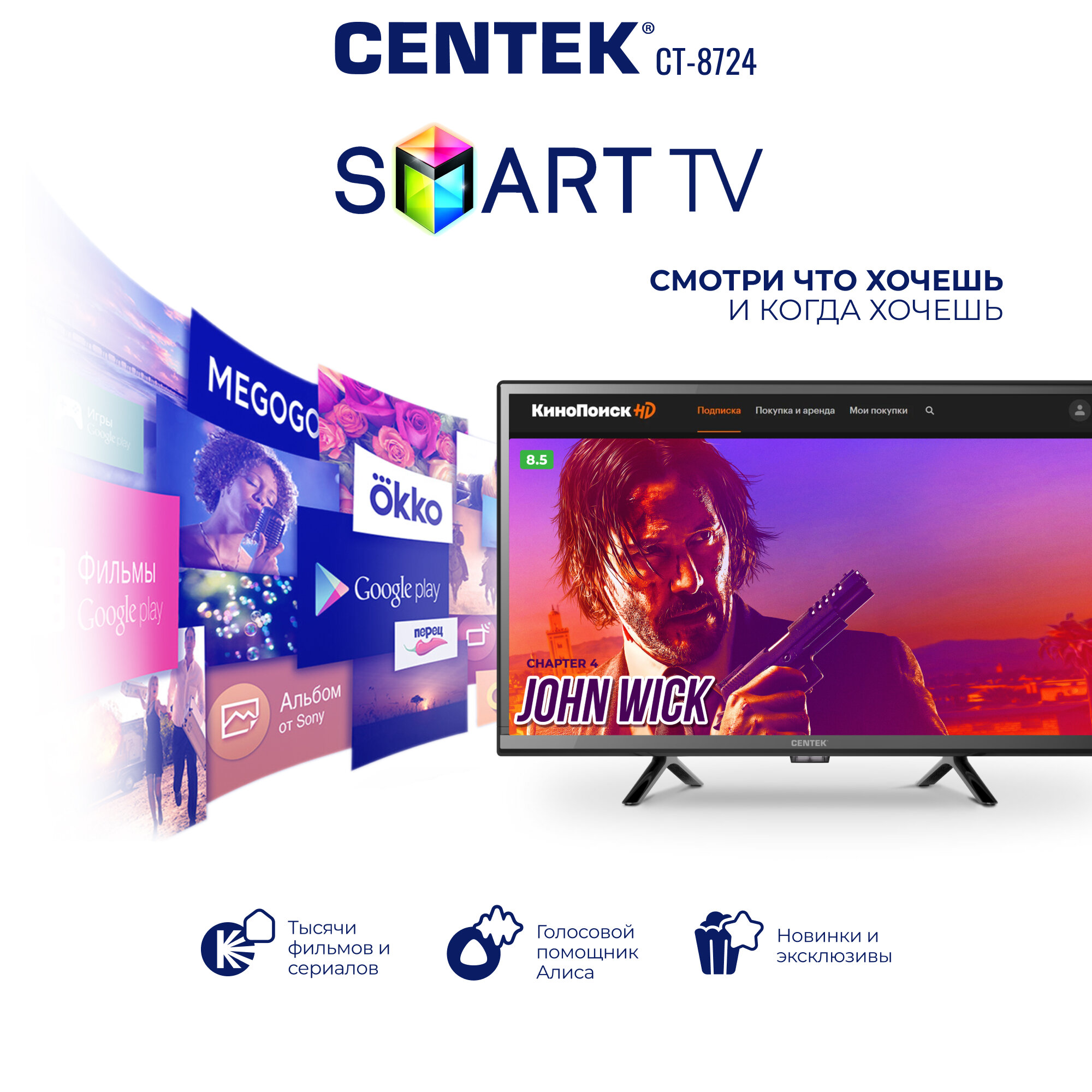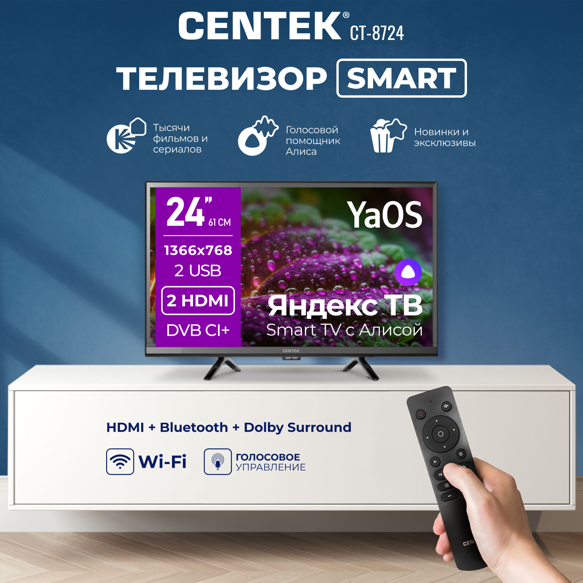 Телевизор CENTEK CT-8724: 24 дюйма, LED SMART, HD, Wi-Fi, Bluetooth, Яндекс YaOS, Алиса