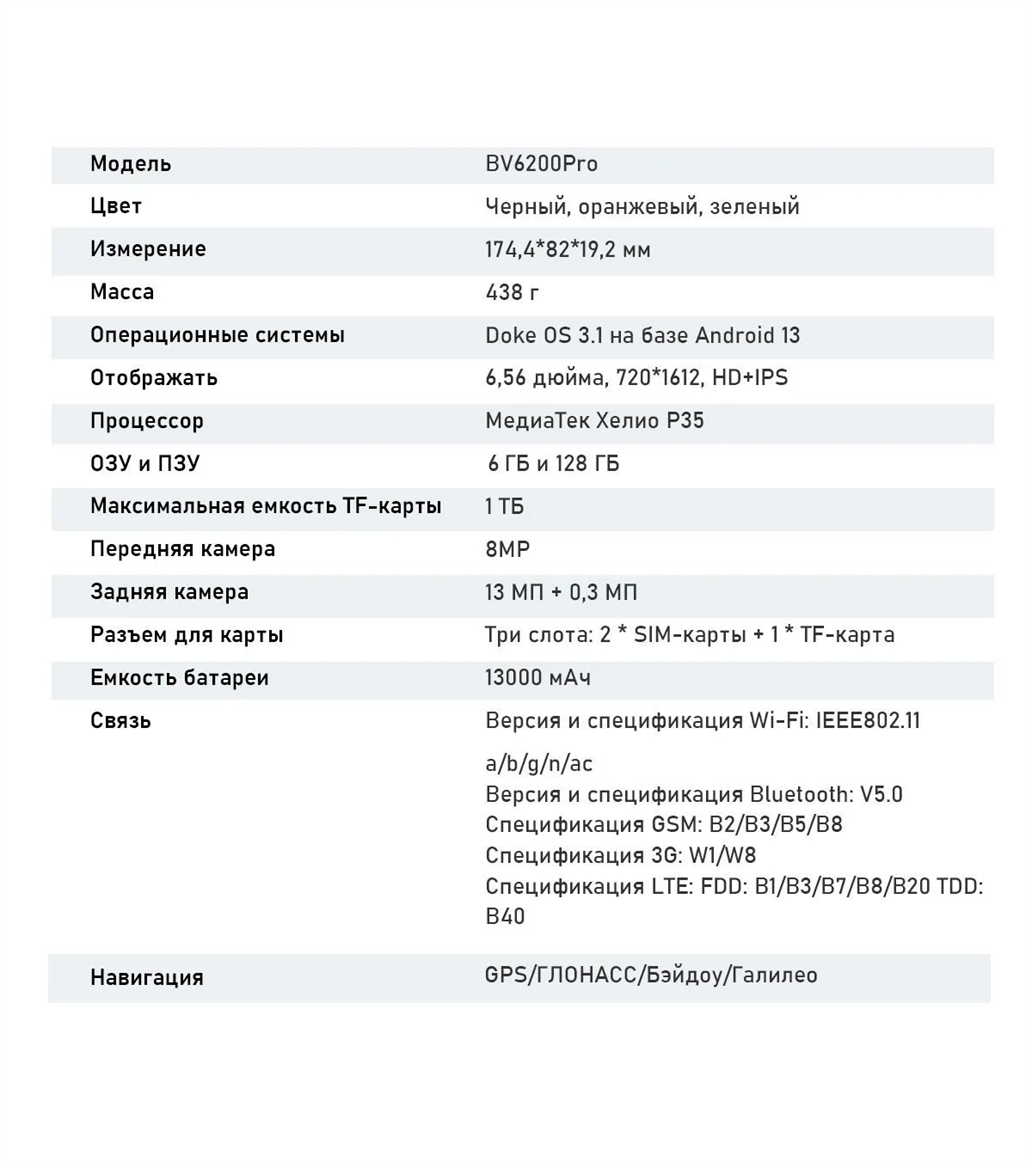 | Заводская комплектация | 1 х Блэквью BV6200 Pro 1 х USB-кабель 1 х адаптер питания 1 х экранная пленка 1 х Руководство пользователя |