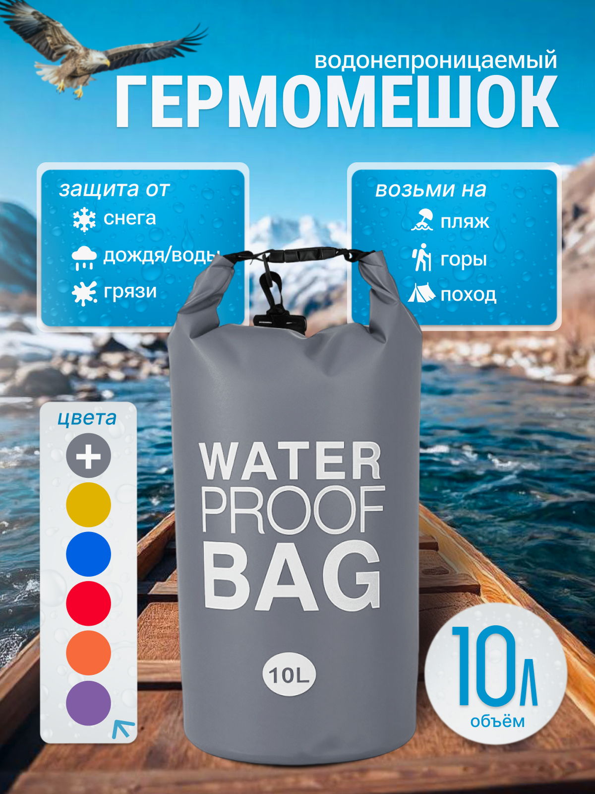 Купить Гермомешок, водонепроницаемый, водоотталкивающий серый 10 литров, Water Proof Bag