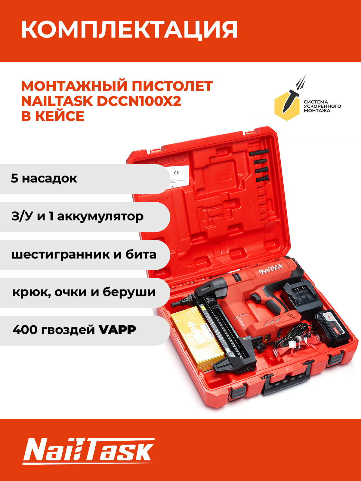 Монтажный аккумуляторный пистолет по бетону NAILTASK DCCN100x2 интересное: